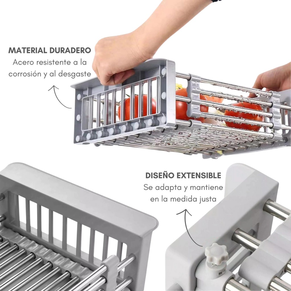 Este escurridor extensible es una solución práctica, versátil y eficiente para el orden y secado en la cocina. Perfecto para optimizar el espacio y garantizar que tus utensilios y alimentos se sequen de manera adecuada.
