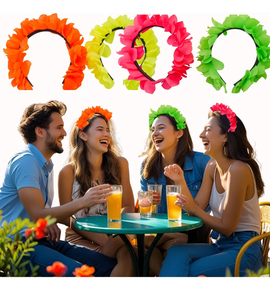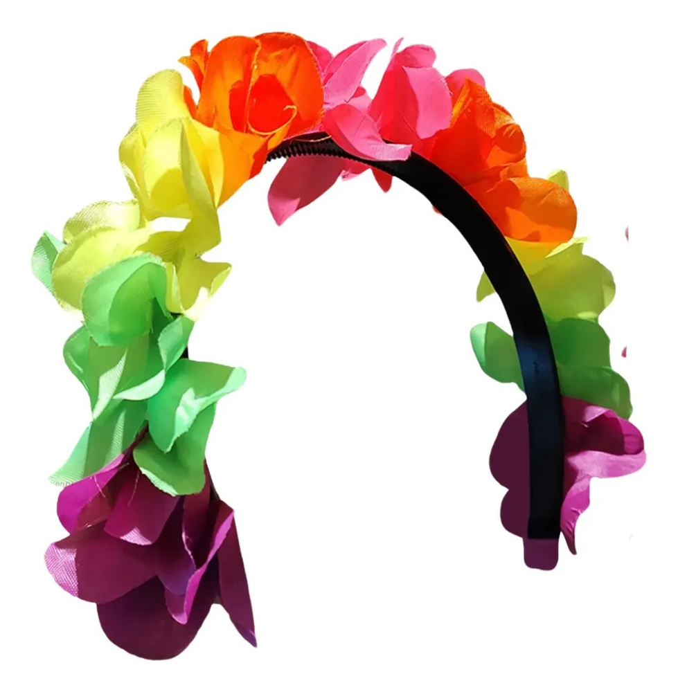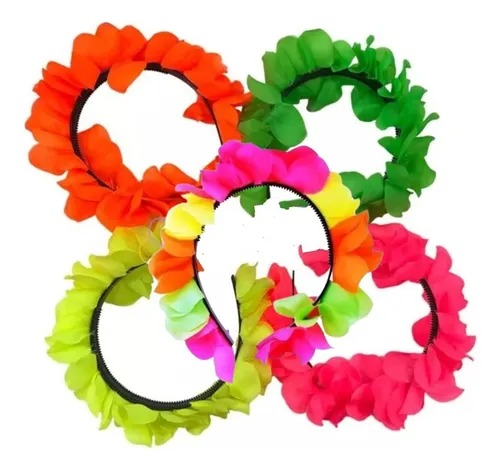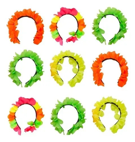 Vincha Hawaiana de flores de tela neon. Contiene 12 vinchas de diferentes colores fluo. Ideales para accesorios de carnavales carioca, cumpleaños, tandas temáticas Hawaianas o como acceosrio para disfraces.