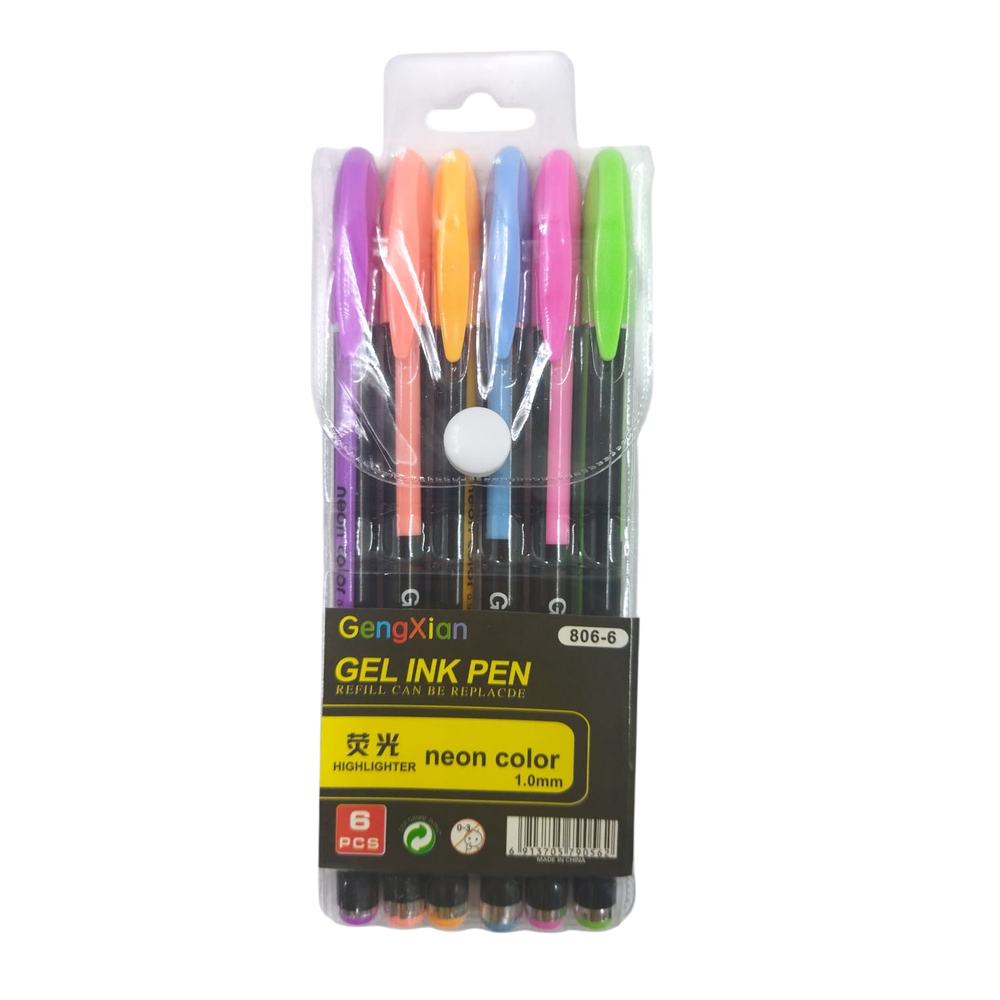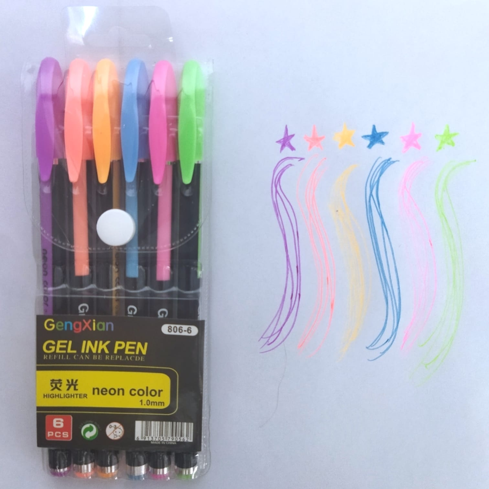6 birome gel fluor, violeta, salmon, naranja, celeste, rosa y verde.