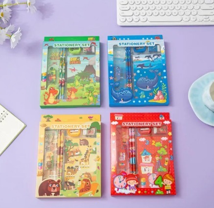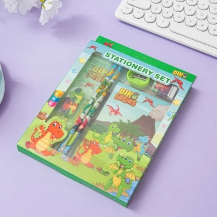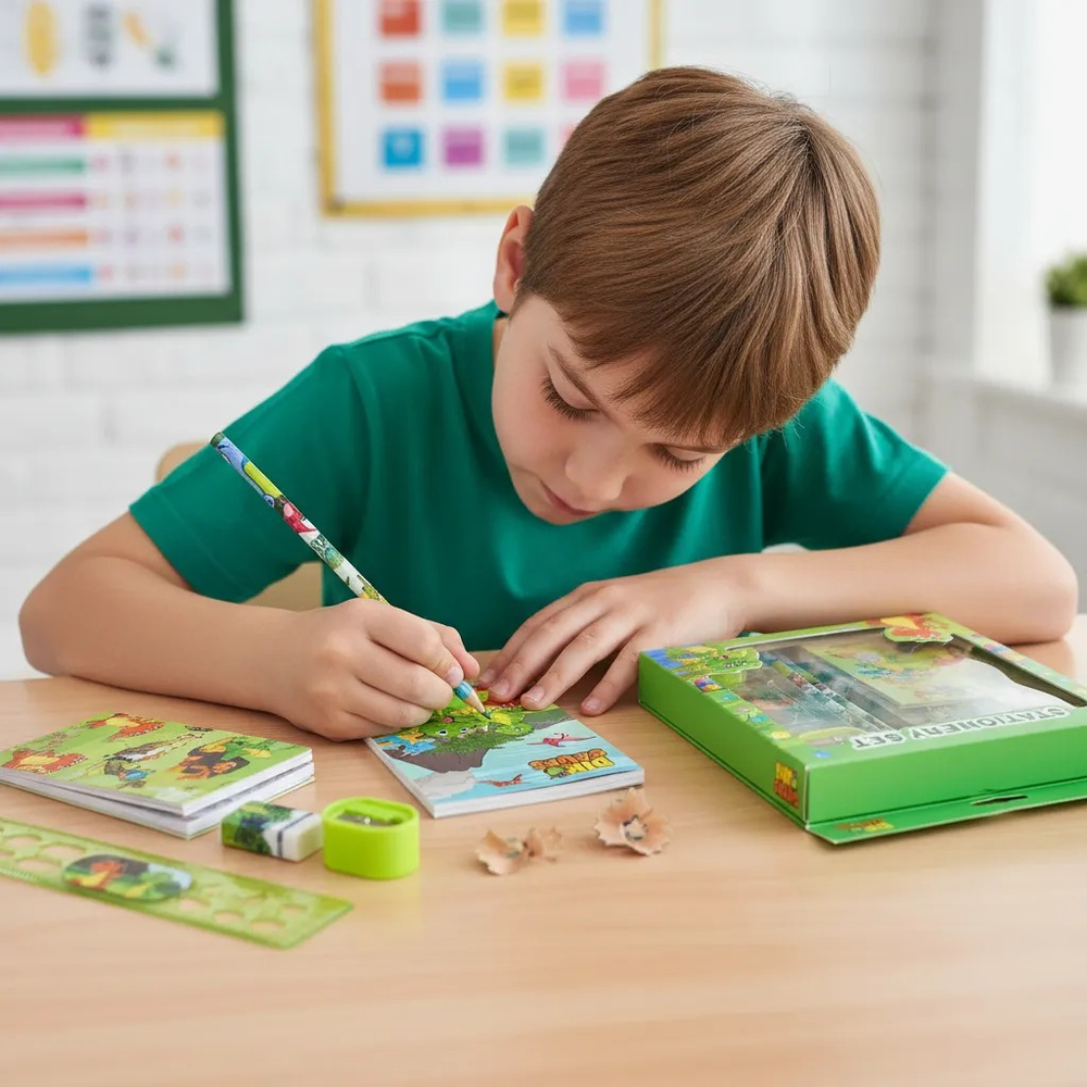 Set escolar de 6 piezas, la caja incluye 2 lapiz, 1 goma, 1 sacapunta, 1 regla y 1 libreta, todos los productos personalizados con animales. DINOSAURIO - BALLENA - SELVA (Consultar modelos disponibles).