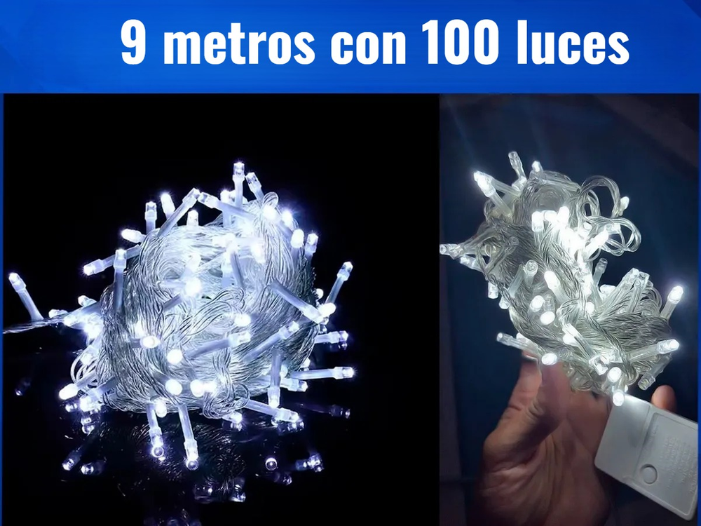 Guirnalda de luz de 100 led, color blanca fría, 8 multifunciones, largo 9 metros, funciona a 220 v .Apto para iluminación decorativa en interior