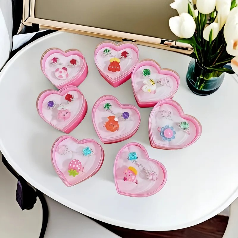 Caja de corazón rosa con 3 anillos infantil.