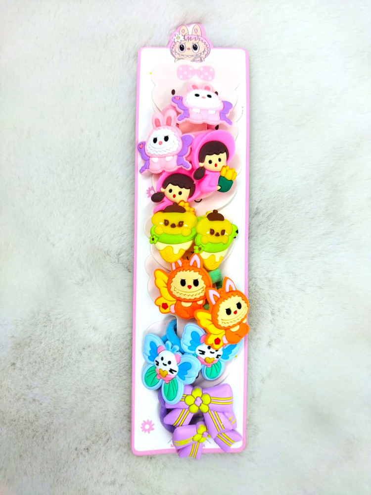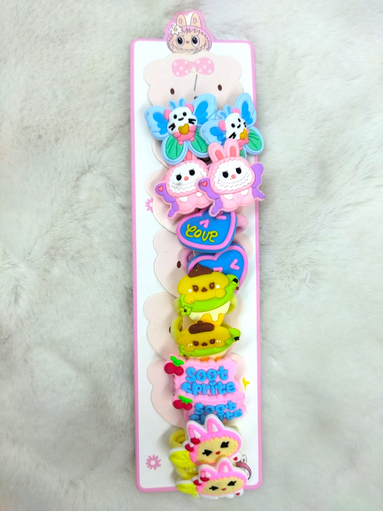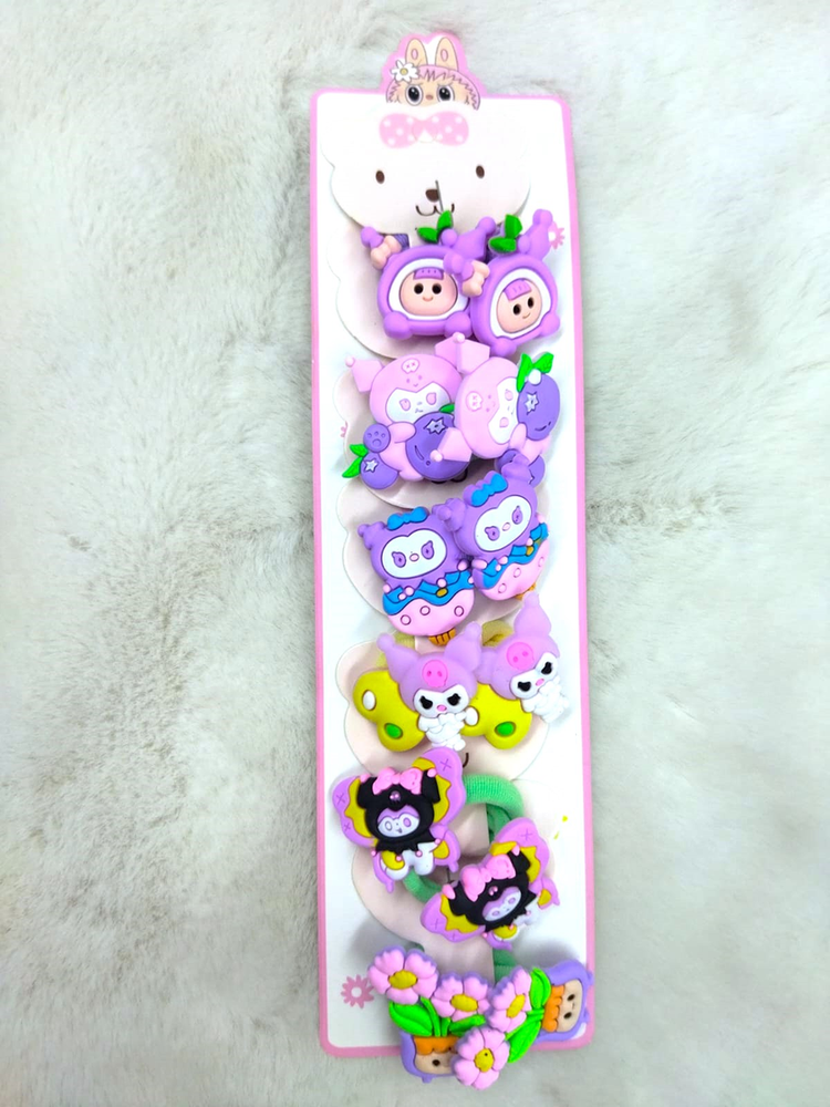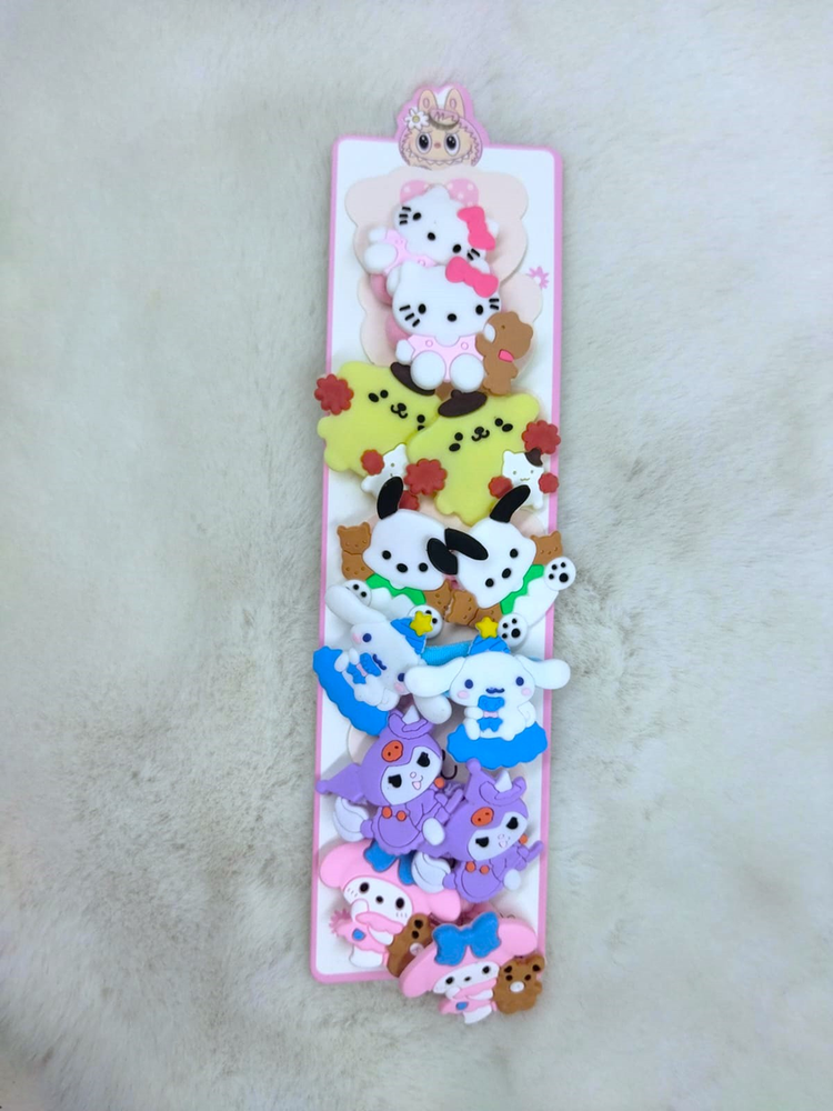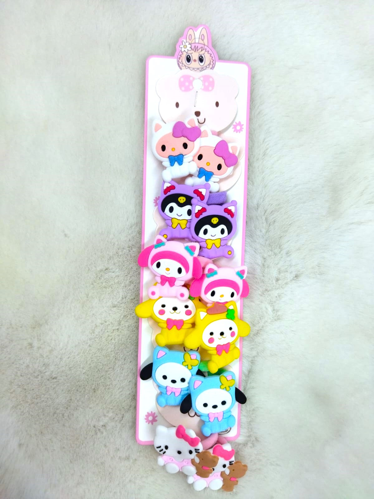 6 pares de colitas (12 uni) adornadas con personajes como Kuromi, Kitty, Melody, etc. Vienen mas de 6 modelos, consultar modelos disponibles.