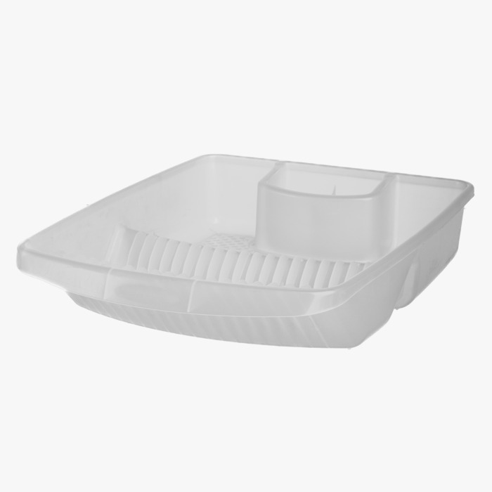 Escurridor de plato transparente, cuenta con varias divisiones para plato, vaso y utensilio.