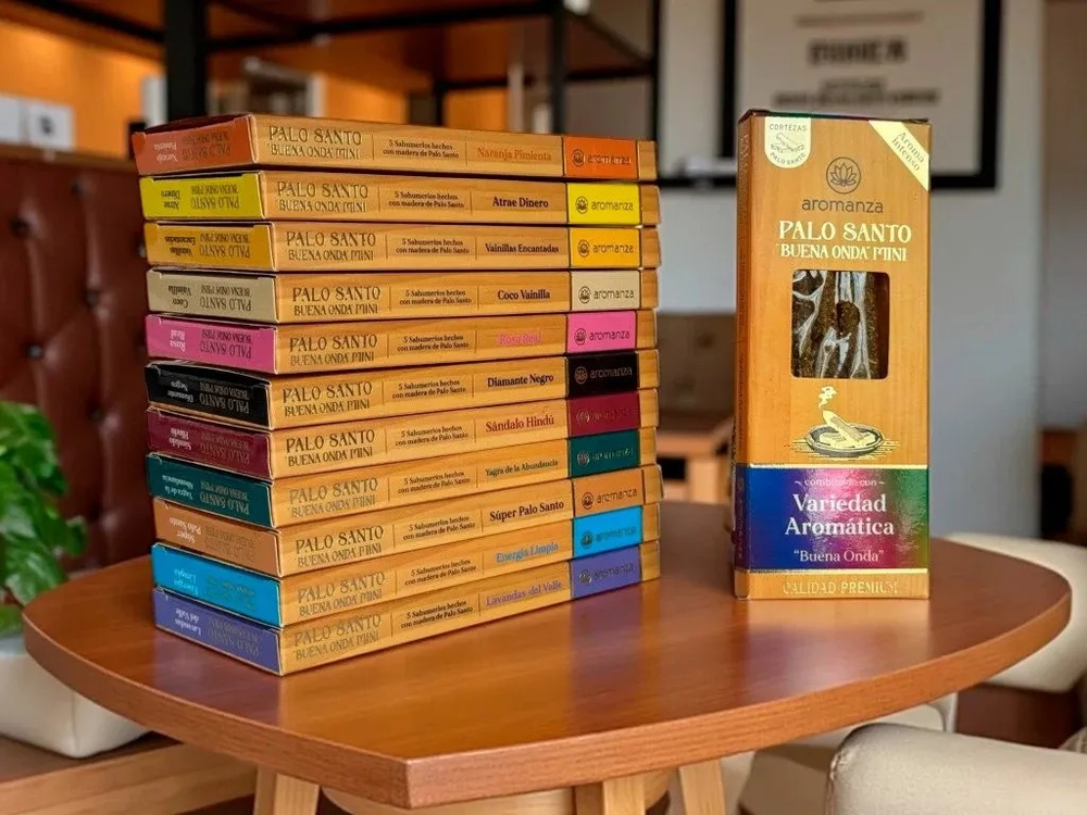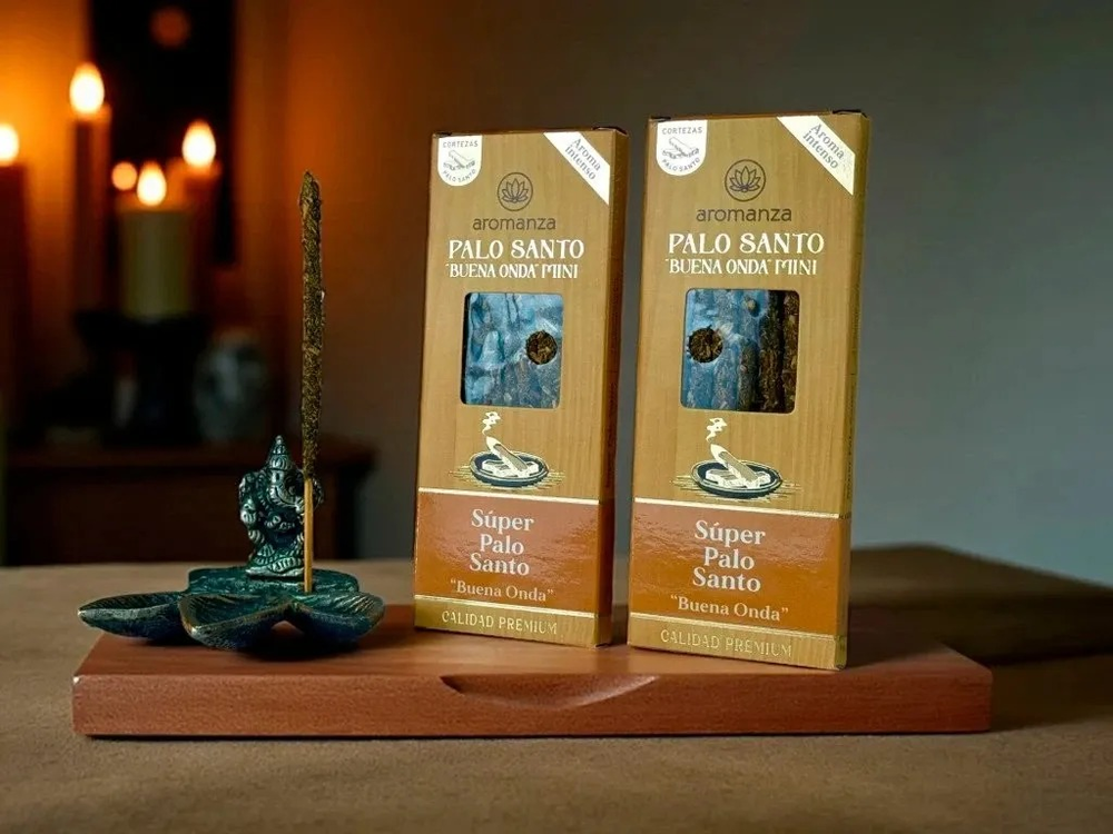 Mini Palo Santo Buena Onda de Aromanza Poderosa unión entre fragancias afrodisíacas creadoras de un clima ardiente e inspirador. La composición de estos sahumerios generan un clima placentero y apasionado. -5unidades por caja, hecho artesanalmente con madera de palo santo