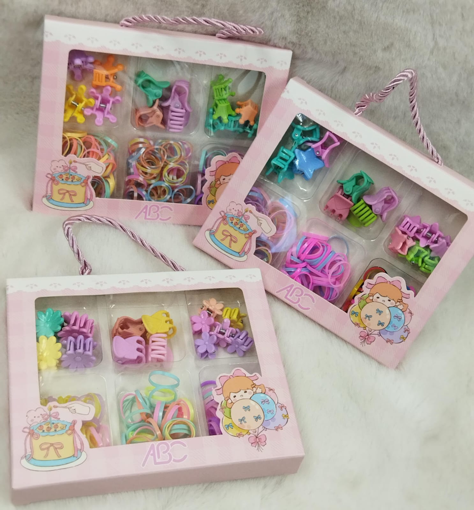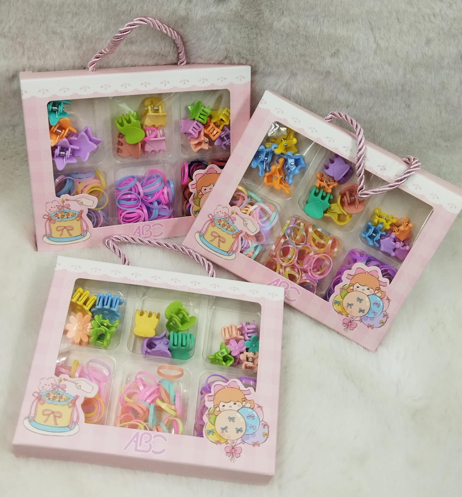 Caja con diseño de carterita, viene con 6 divisiones. 8 broches medianos 6 mini hebillas 3 divisiones de gomitas para pelo.