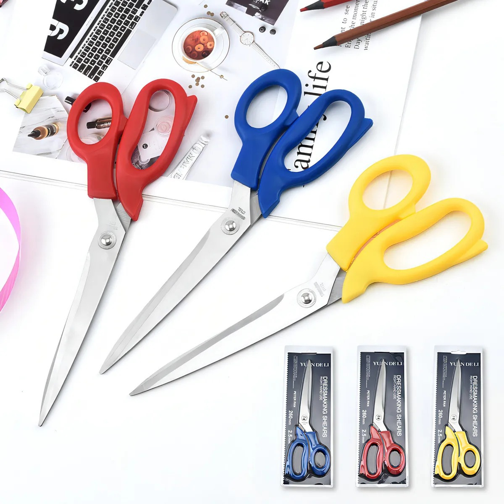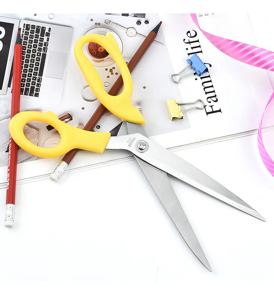 Tijera de acero inoxidable profesional ideal para costura y papelería. Por su gran filo, ofrece una buena capacidad de corte, apto para utilizar en varias tareas. Apto para la confección, el bricolaje y los amantes de la artesanía. Para uso en la mano derecha o izquierda. Color: Acero y mango rojo, amarillo o azul aleatorio
