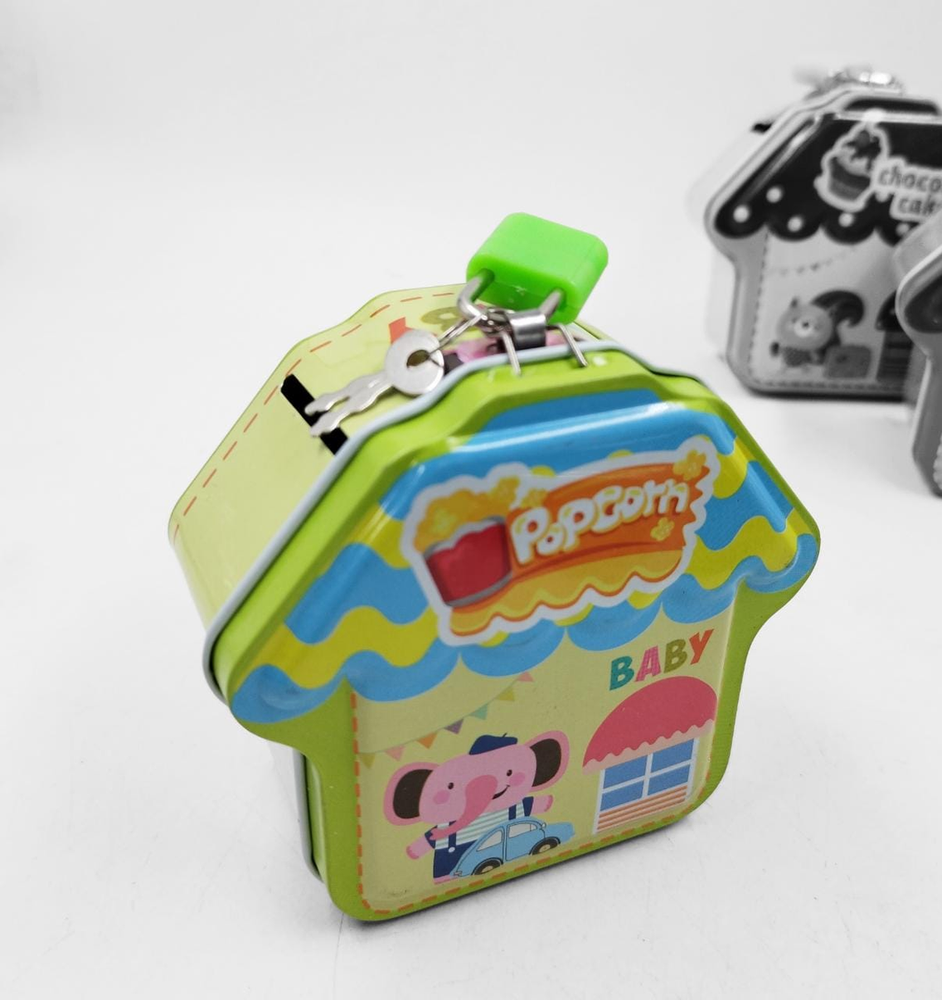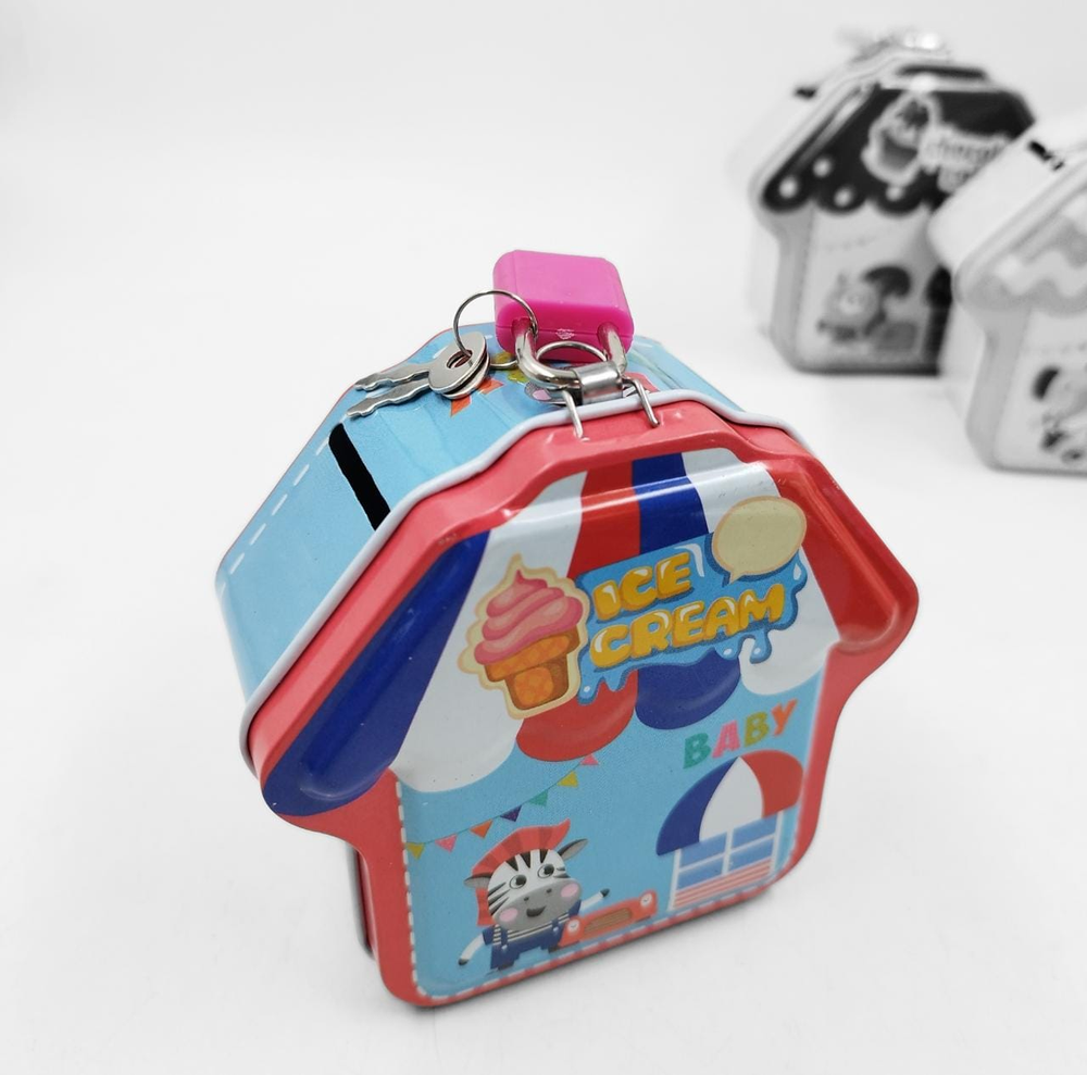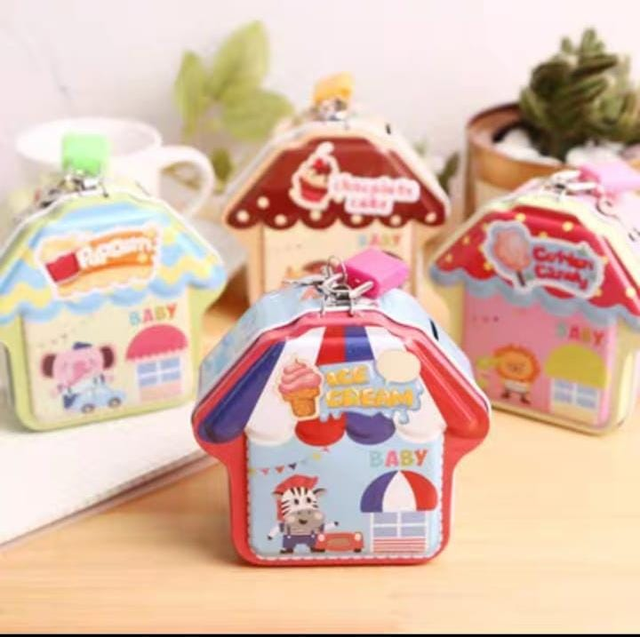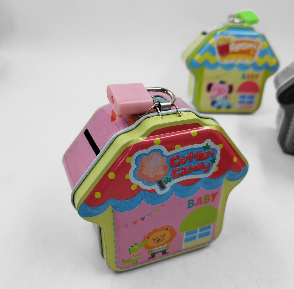 alcancia lata infantil con candado con forma de cupcake, ideal para souvenir de cumpleaños. Consultar colores disponibles.