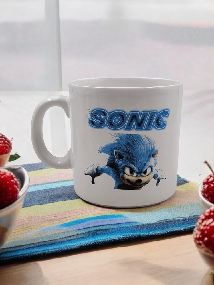 taza ceramica recta tipo mugg, linea infantil, con estampa de motivo " sonic ". producto categoría: bazar.