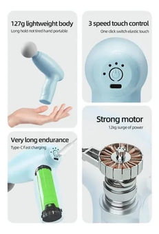 Disfruta de un masaje profundo de hasta 5 cm que ayuda a relajar los músculos, mejorar la circulación y aliviar la tensión acumulada. Ideal para deportistas, personas con trabajos sedentarios o quienes buscan un momento de relajación en casa. Características principales: Ultraligera (127 g) – Fácil de usar, no cansa la mano. Motor potente – Con fuerza de hasta 12 kg, asegura un masaje efectivo. 3 velocidades ajustables – Control táctil con un solo botón. Batería de larga duración – Carga rápida por USB Tipo-C. Diseño ergonómico y portátil – Perfecta para llevar al gimnasio oficina o viajes.