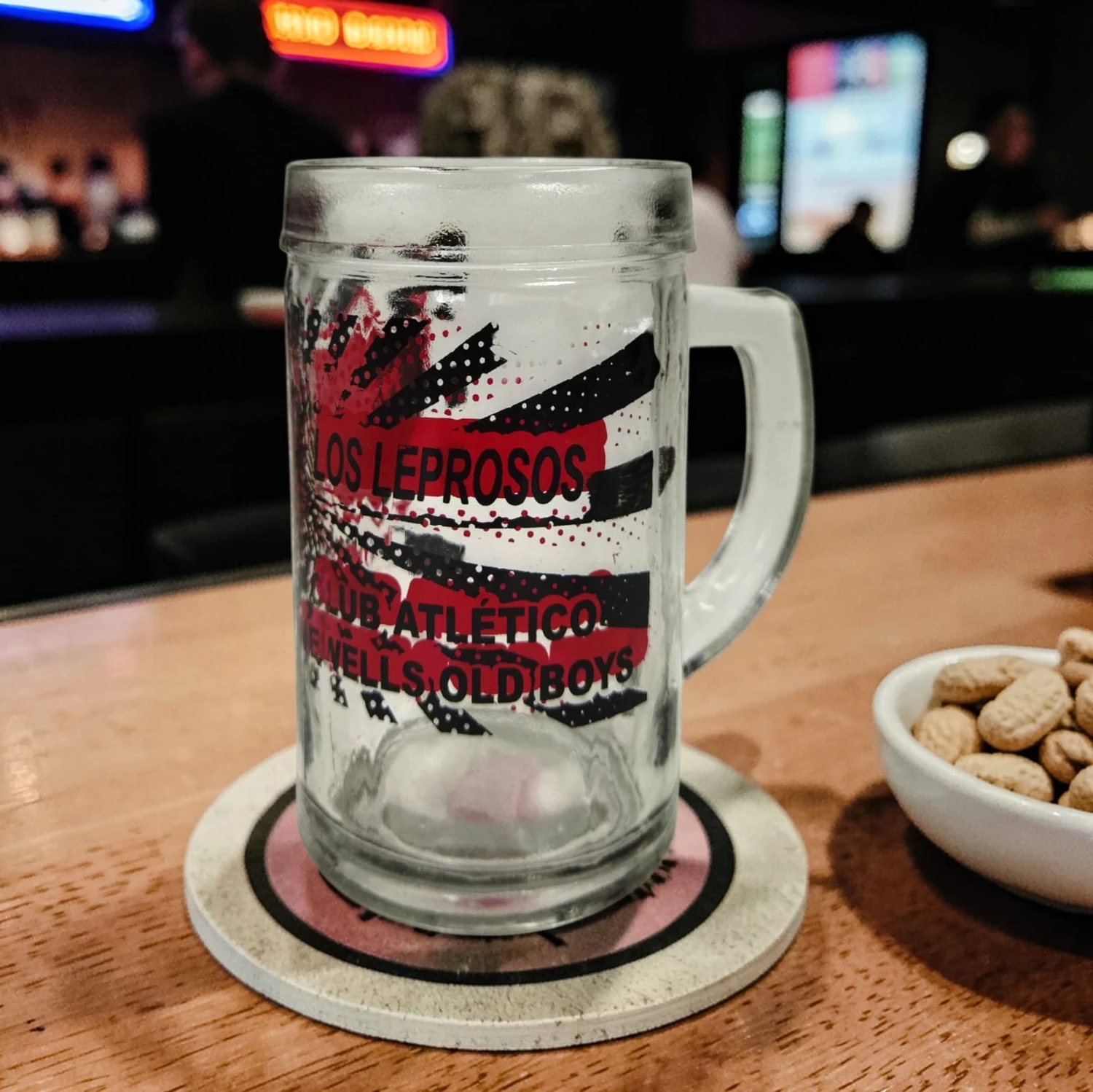 Vaso chopp de vidrio con manija, estampa de N.O.B.