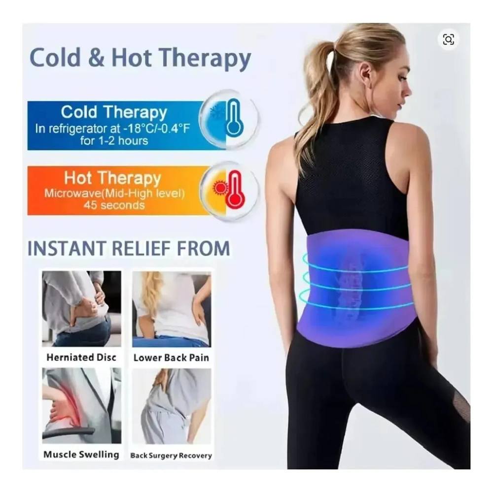 Faja Lumbar Antidolor con Almohadilla de Gel Frío/Calor Faja lumbar ajustable diseñada con almohadilla de gel reutilizable que permite aplicar terapia en frío o calor. Ofrece cobertura amplia en la zona baja de la espalda gracias a su diseño flexible con cierre de velcro. Tamaño: Ajuste universal hasta 54” de contorno de cintura Materiales: Almohadilla de gel médico + funda de tela elástica con velcro Funciones: Terapia en frío (freezer 1–2 h) o en calor (agua caliente, lista en minutos) Especificaciones: Reutilizable, flexible, de colocación sencilla y segura Componentes: 1 faja lumbar con almohadilla de gel incorporada