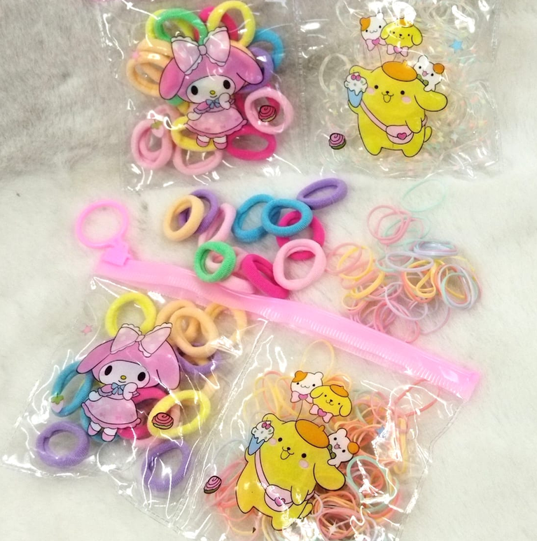 Colita de pelo y gomita elástica, vienen en sobre de zip con división.