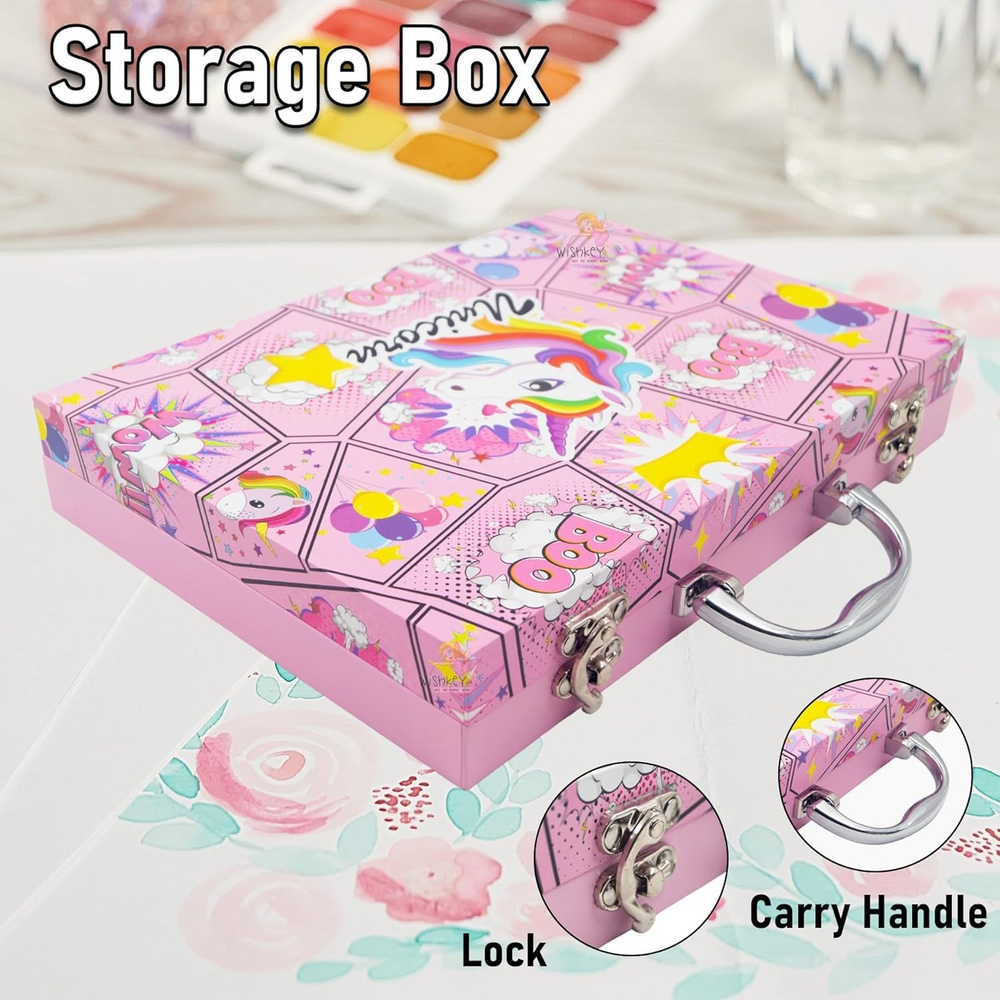 Valija de arte, traen 67 piezas.Incluye 12 crayola, 12 palitos de cera colores, 12 fibras, 12 colores de madera,12 acuarelas de cera colores variados,1 lápiz, 1 pincel, 1 regla, 1 borrador, 1 sacapuntas, 1 plasticola.