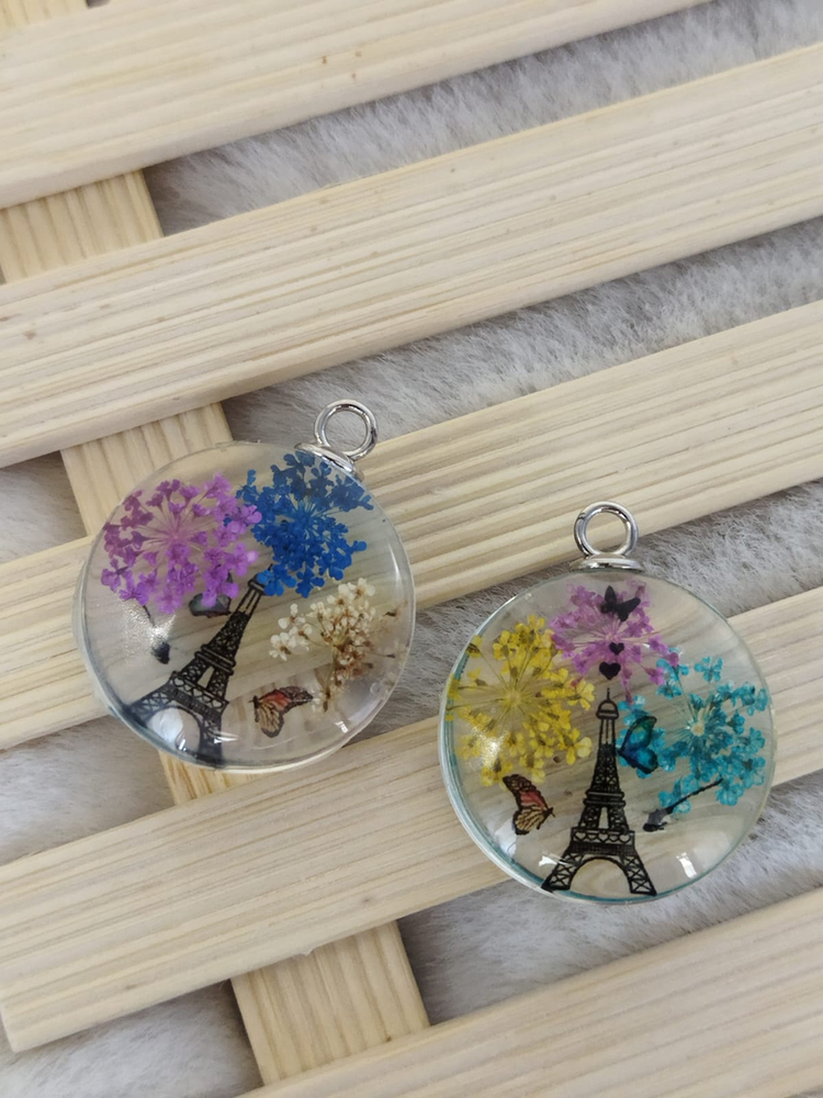 Dije redondo de resina adornada con torre eiffel, mariposa y flor.