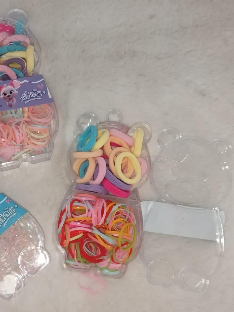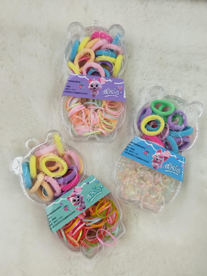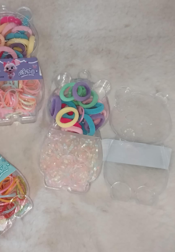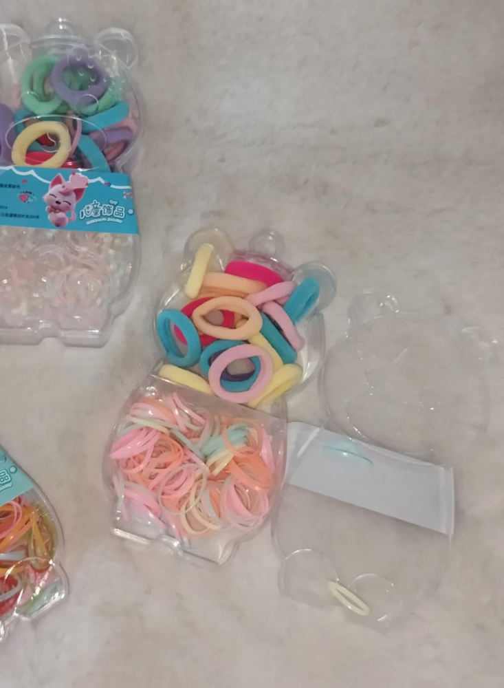 Caja acrílica en forma de osito con colitas y gomitas para el pelo.