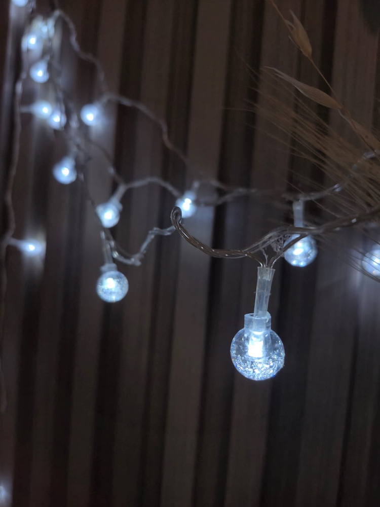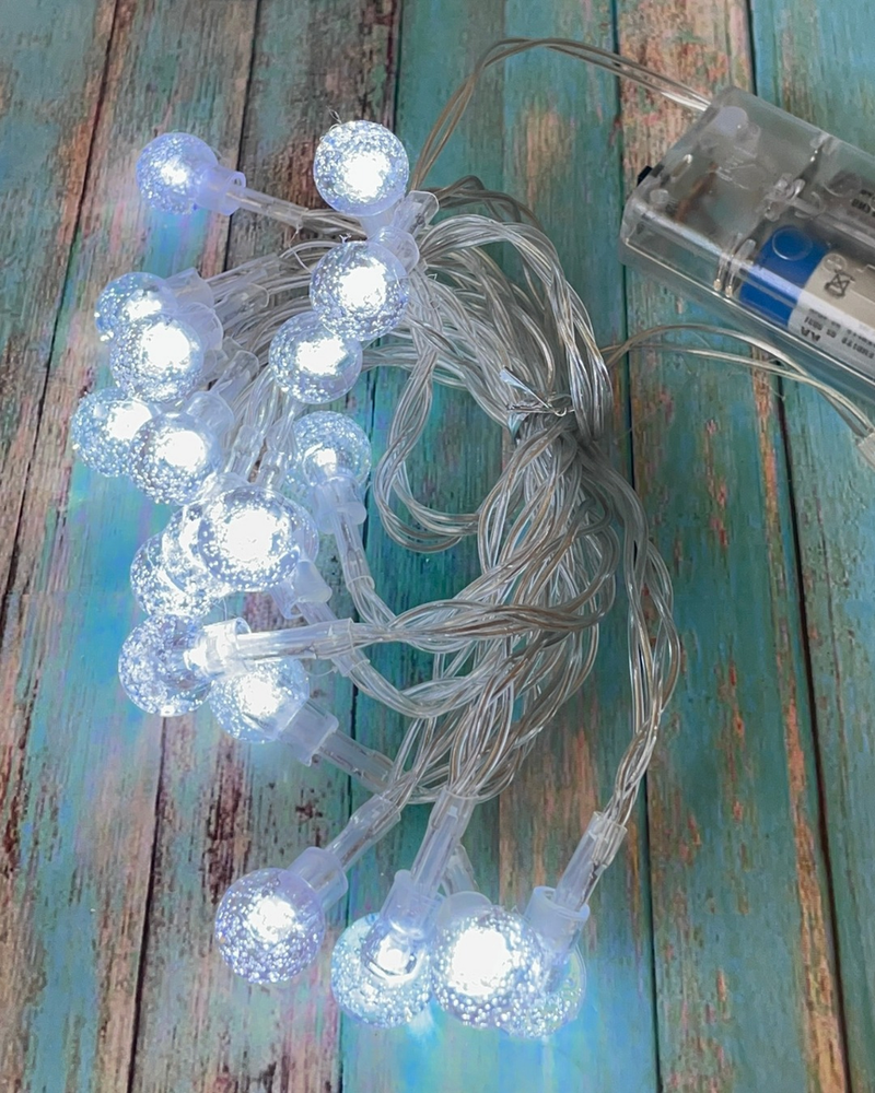Luz guirnalda de 3 metro de largo, contiene 20 bolitas plastica transparente, con luz frías, funcionan con 2 pilas AA. (NO INCLUIDAS)