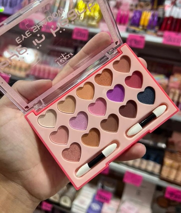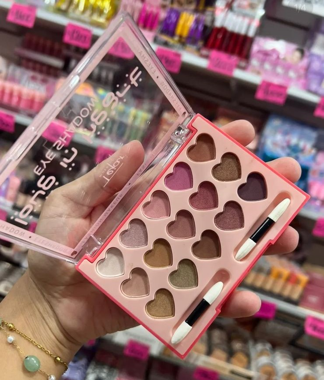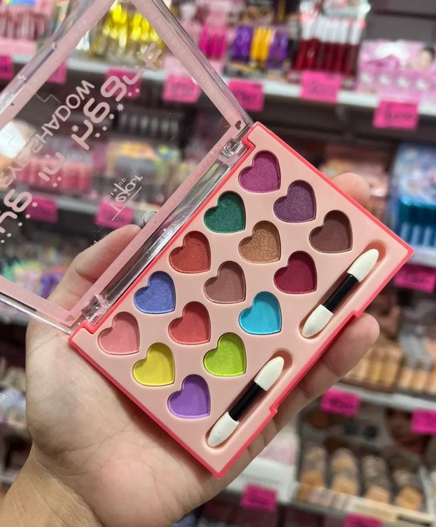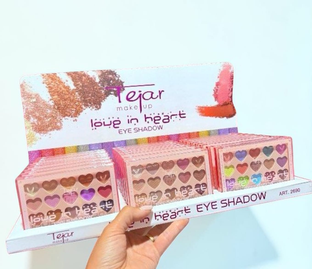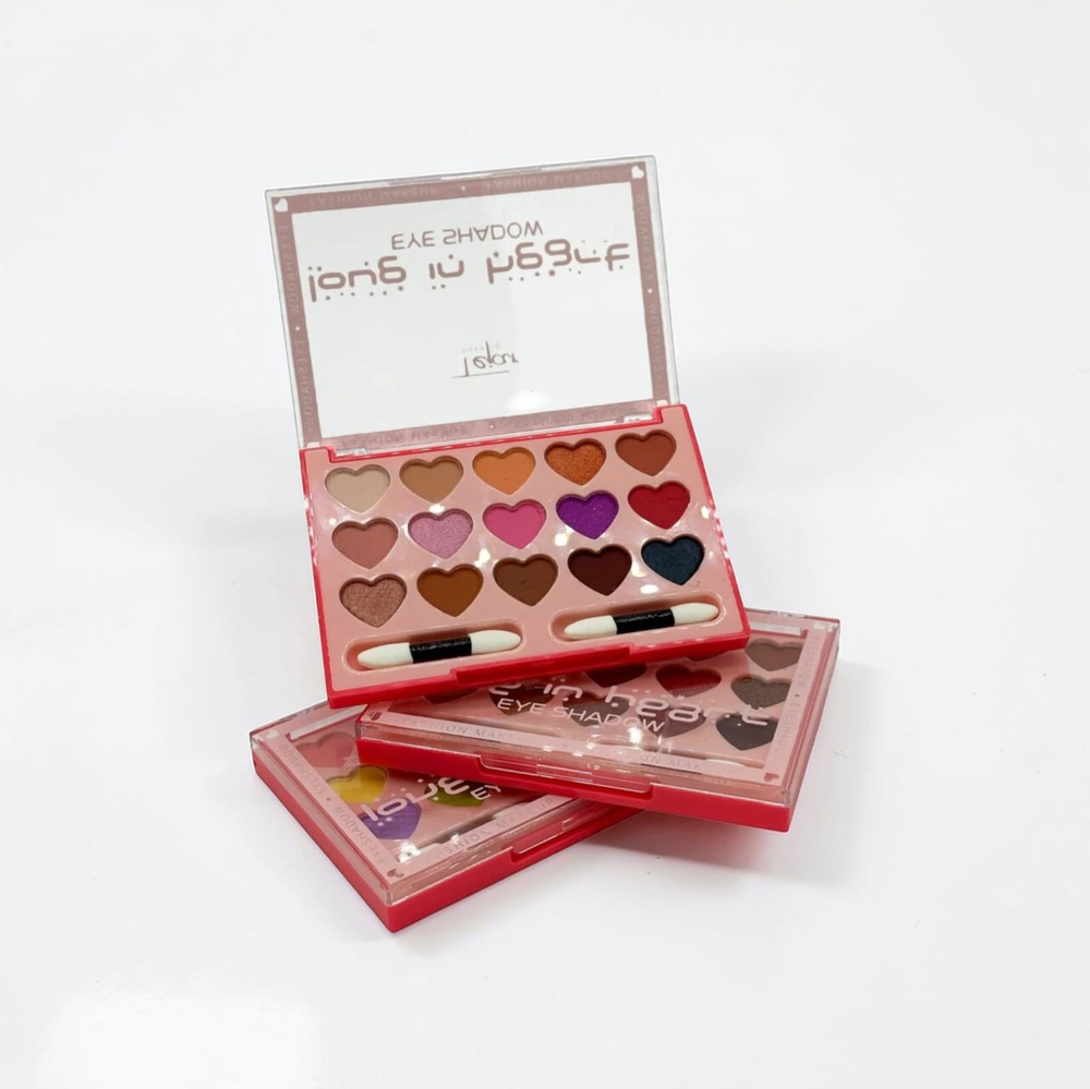 Petaca de sombras para ojo, vienen 15 colores en forma de corazon. Vienen 3 grupos de colores.