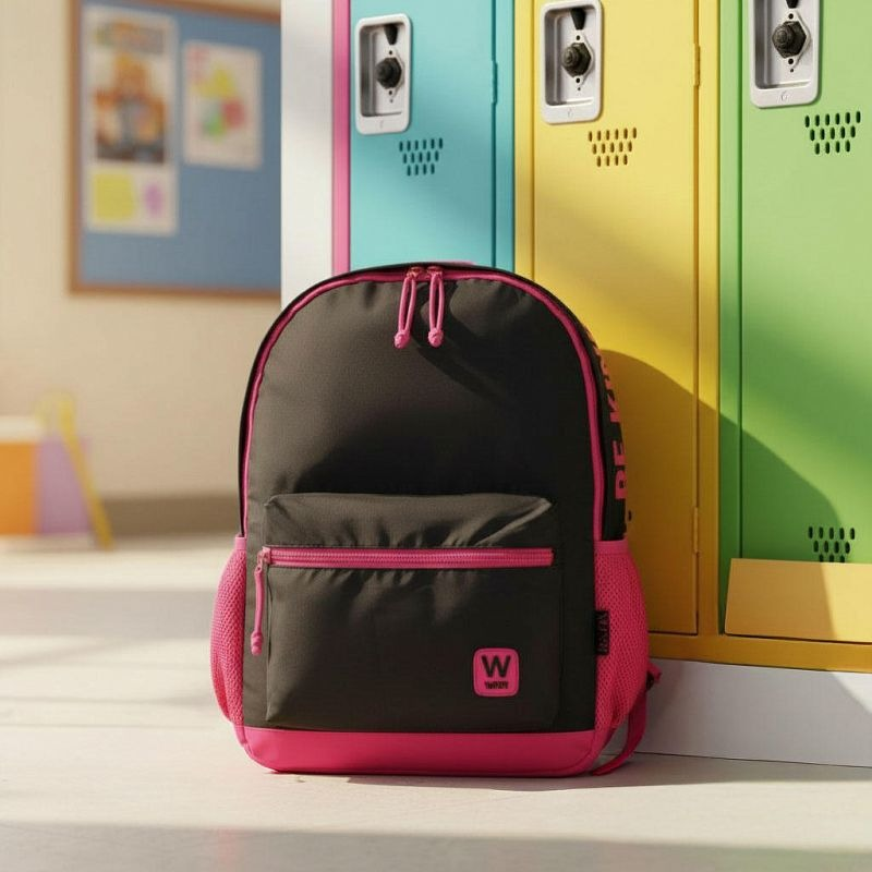 Mochila wbr urban color negro con fucsia. Tiene 2 compartimentos y bolsillo para botellas.