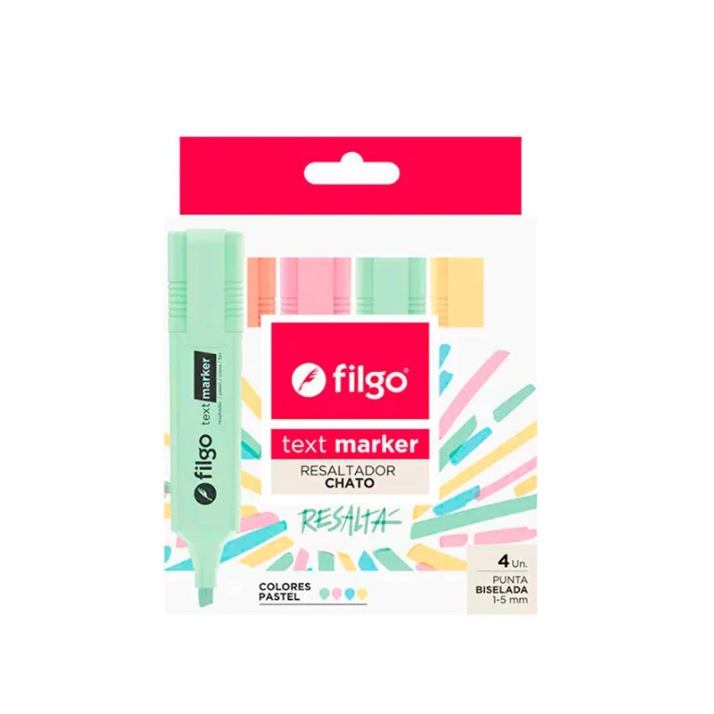 RESALTADOR FILGO, 4 COLORES PASTEL. • Punta biselada 1-5mm • Para resaltar sin correr la tinta • Sin xyleno ni tolueno • Escribe sobre papel, fotocopias o papel fax