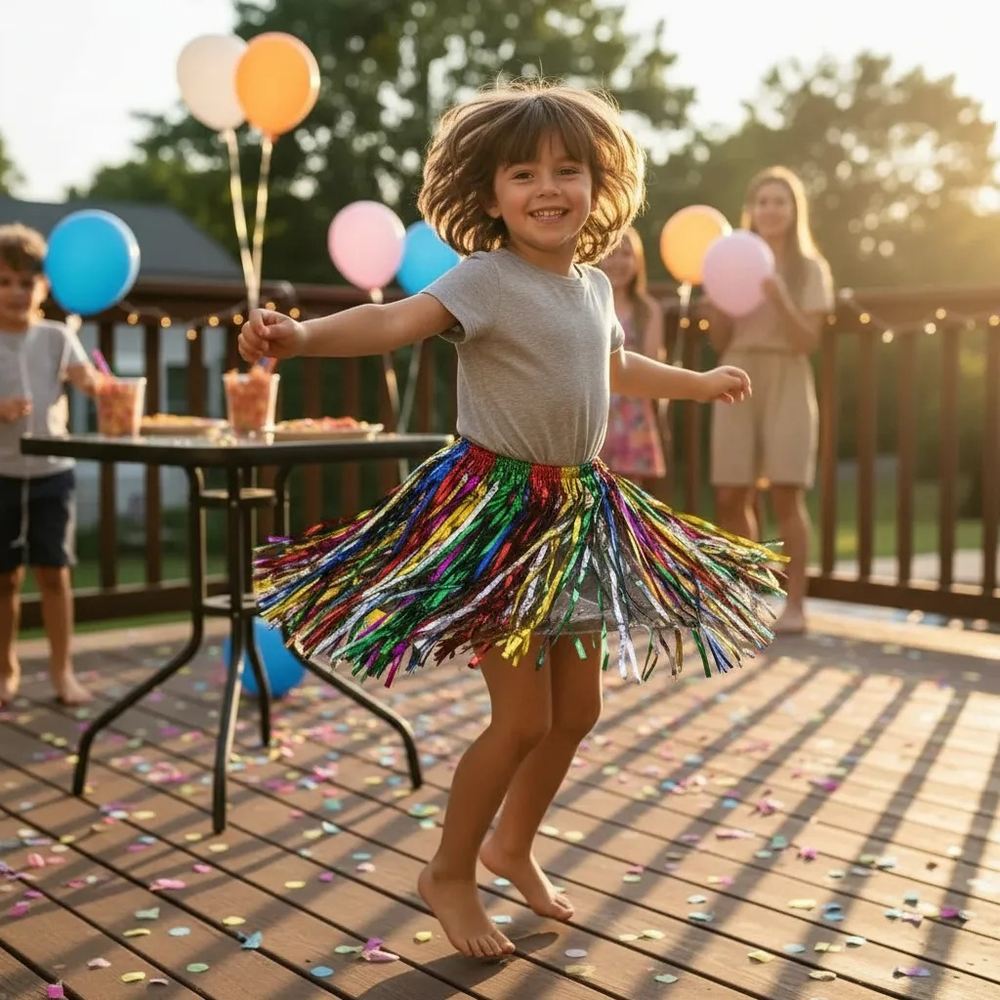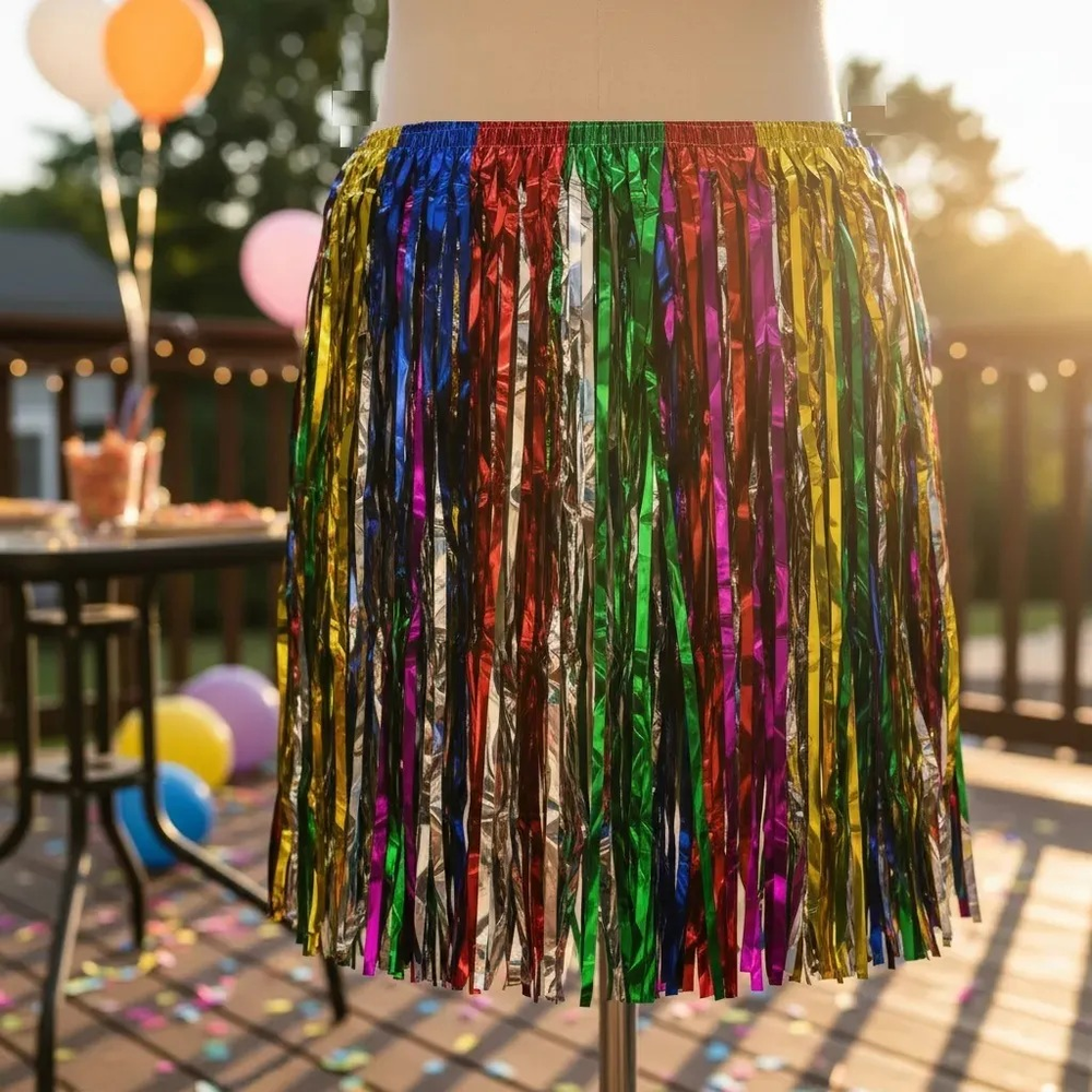 Pollera con flecos de 40cm metalizados. Tiene un ancho de 58cm aprox, viene con un abrojo para hacer mas facil el uso.