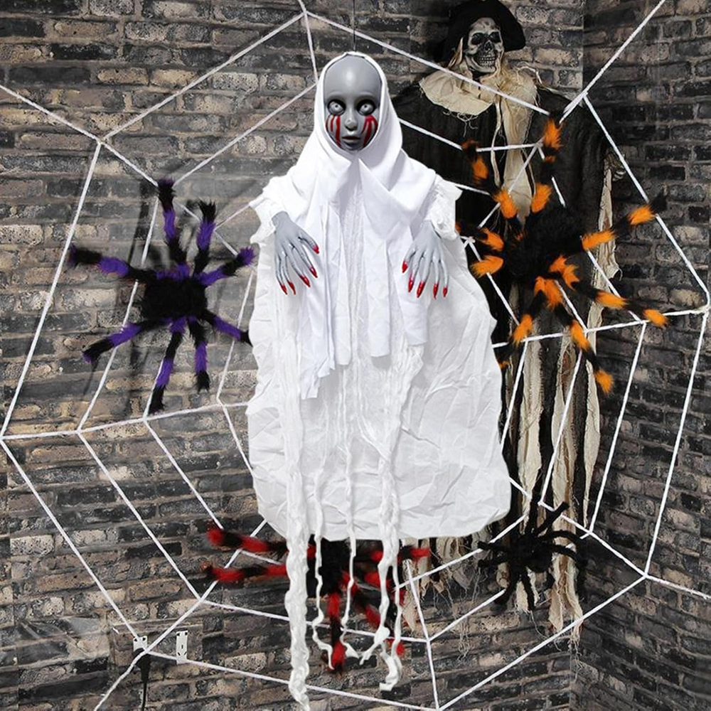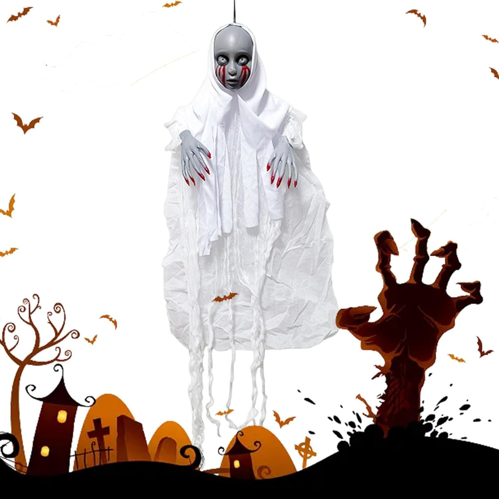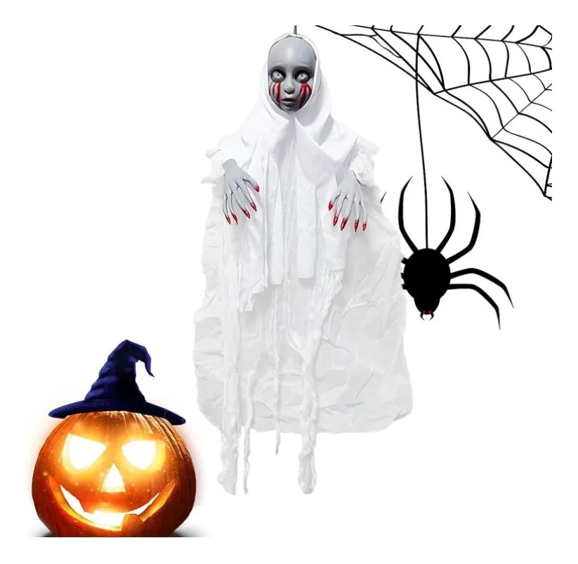 Adorno de colgar con forma de fantasmas con sangre. Vienen por 1 unidad y son usados para decoración de fiestas de terror, de piratas o de halloween. No se puede seleccionar el diseño. Mide: 80cm de largo y la cabeza mide: 10cm de diámetro.