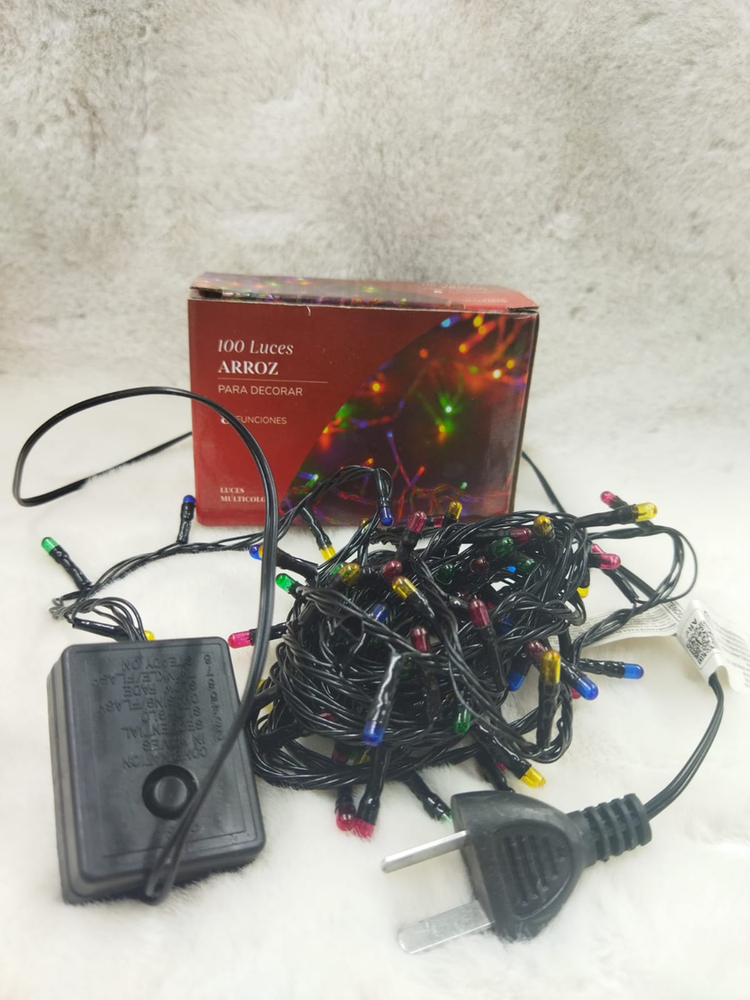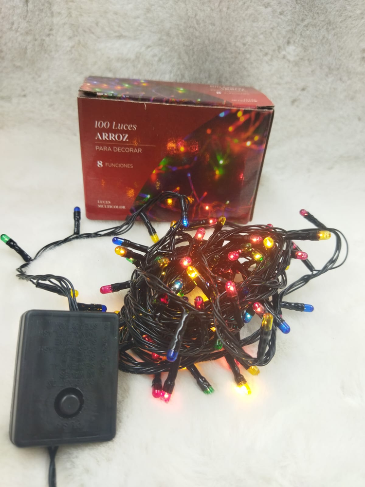 Luz navidad multicolor con cable negro y 100 luces de arroz, cuenta con 8 funciones.