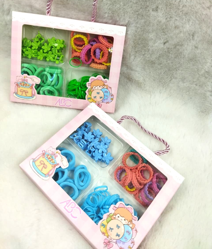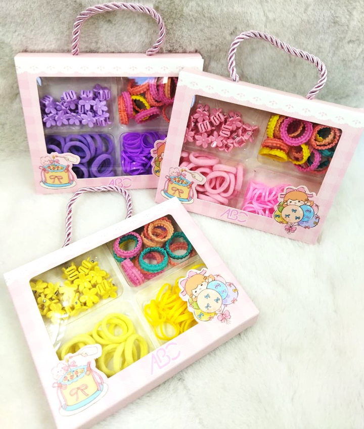 Caja con diseño de carterita, viene con 6 divisiones. 12 mini hebillas 2 divisiones de gomitas para pelo y 1 división de colitas