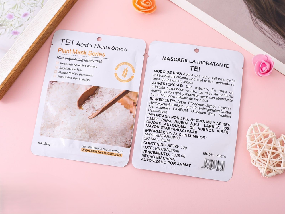 Mascarilla facial iluminadora de arroz -Repone agua e hidratación -Ilumina el tono de la piel -Penetración de múltiples nutrientes -La tela es suave y ligera ESENCIA VEGETAL