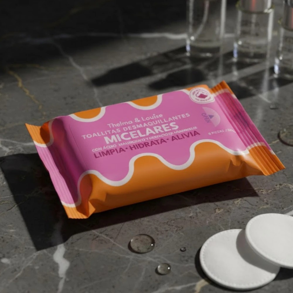 8 toallitas húmedas desmaquillantes micelares con ácido hialurónico y extracto de hamamelis. Limpias, hidrata y alivia. Ideales para escuela, picnic, club, etc.