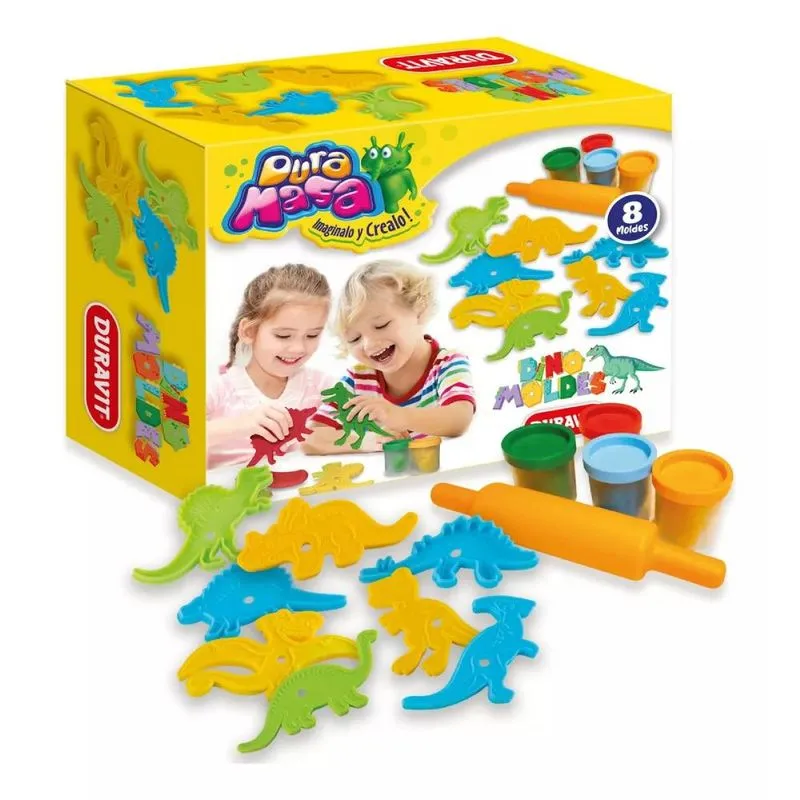 Set Masa Dinosaurios 4 Potes mas 8 Moldes. Este divertido set completo viene con 8 moldes de dinosaurios conocidos, perfecto para amasar y crear diferentes figuras. Además, incluye 4 potes de masa y un palo de amasar, todo lo necesario para que los pequeños artistas den rienda suelta a su imaginación.