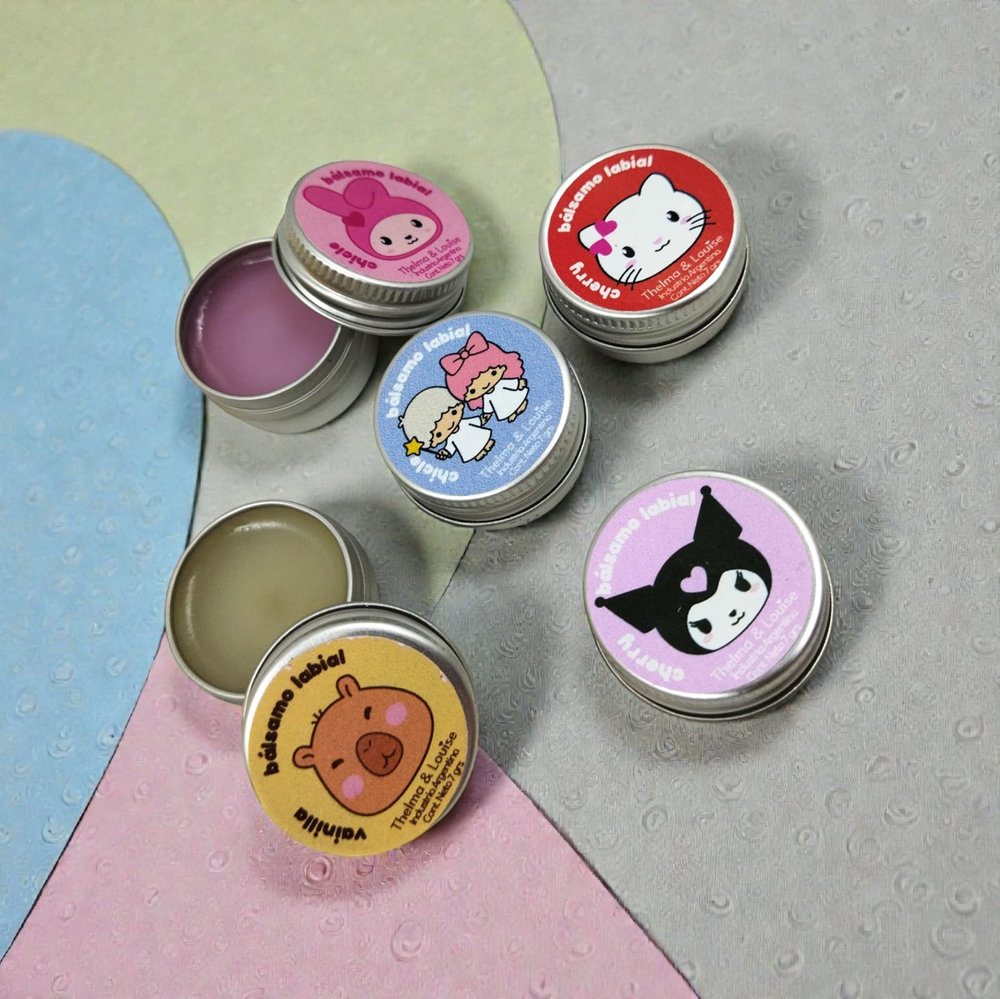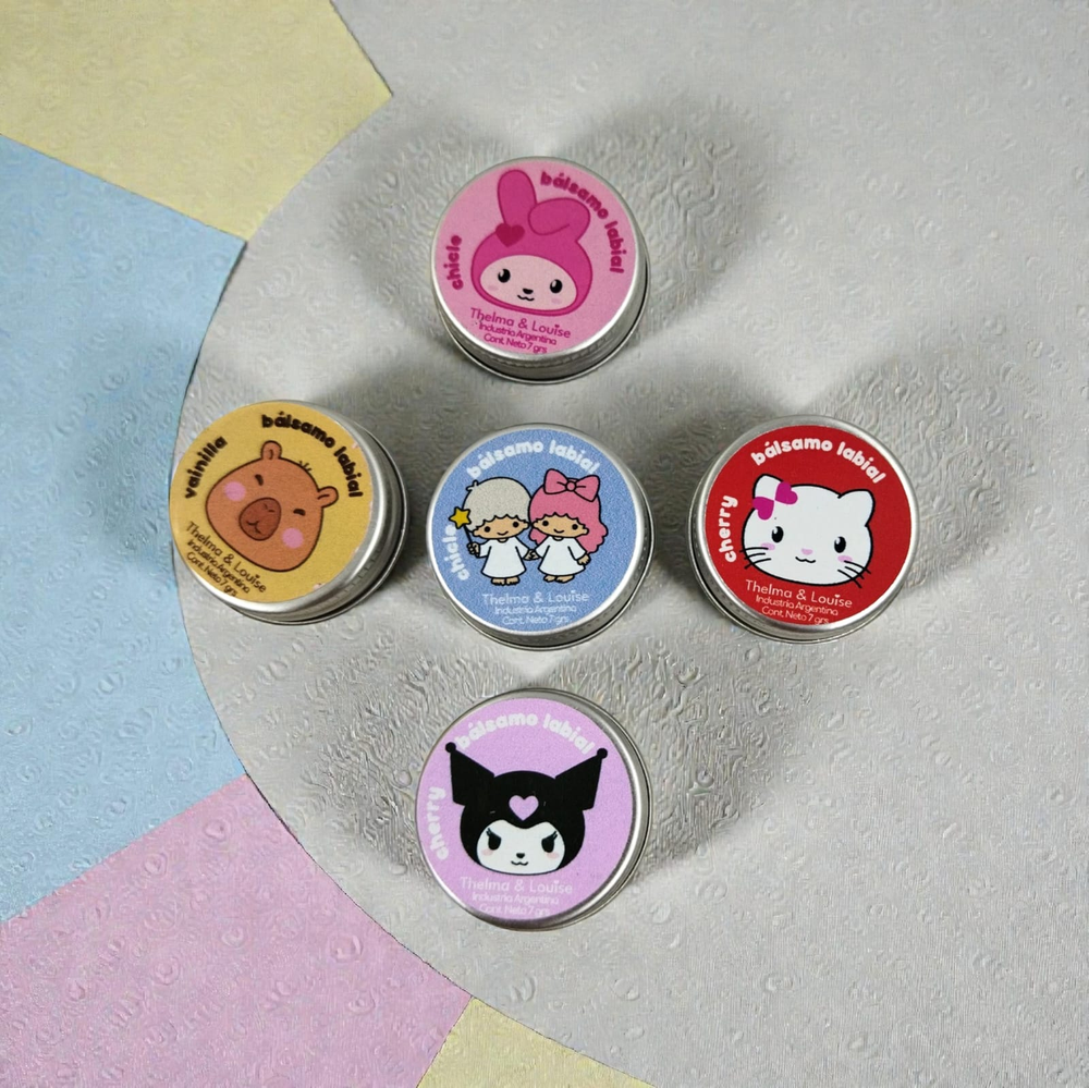 Balsamo labial en lata, vienen personalizados de Kuromy- Melody- Kitty- Capibara- Niños.
