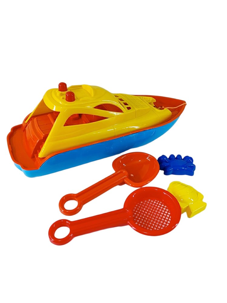 lancha deportivo con 4 accesorios para jugar en playa. los accesorios son 1 palita,1 colador,2 moldes.