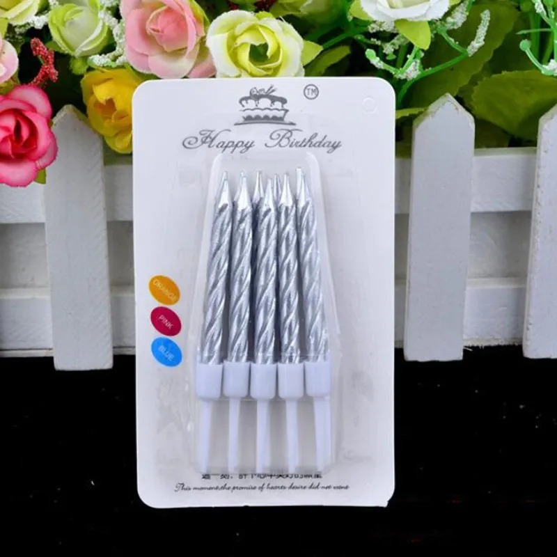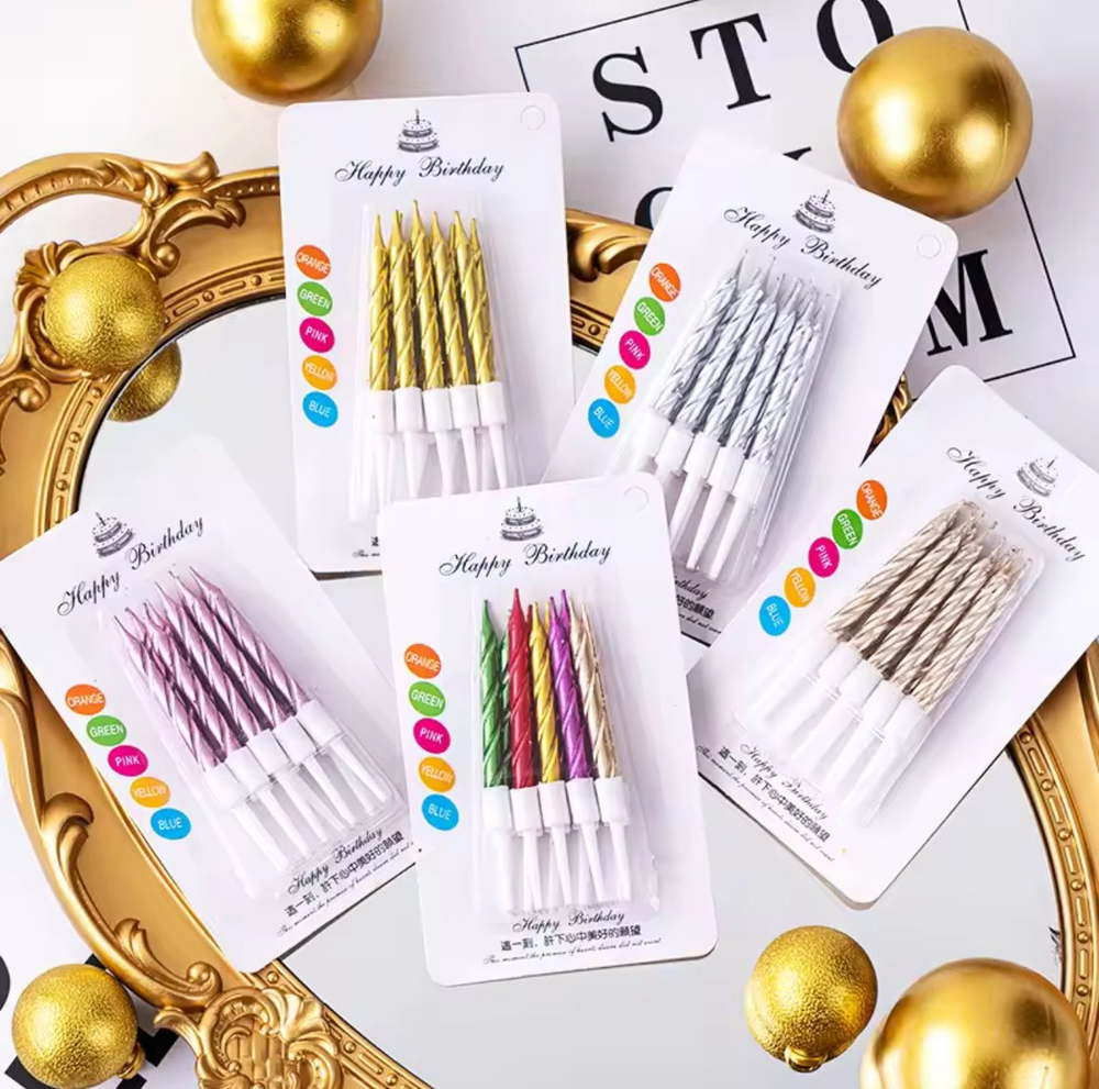 Velita tornada de color metalizada para con porta vela, para adornar torta de cumpleaños u distinto eventos. Disponible en colores azul, rosa gold.