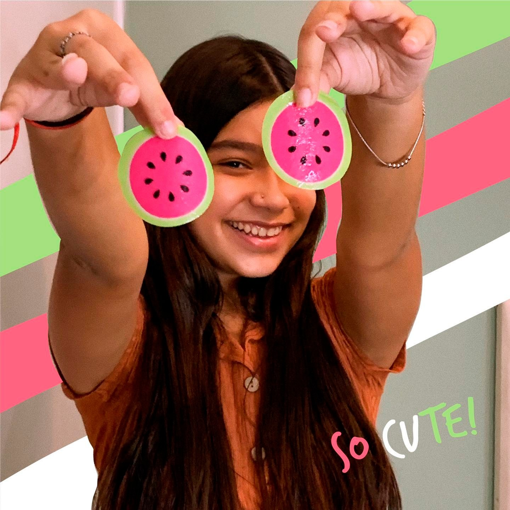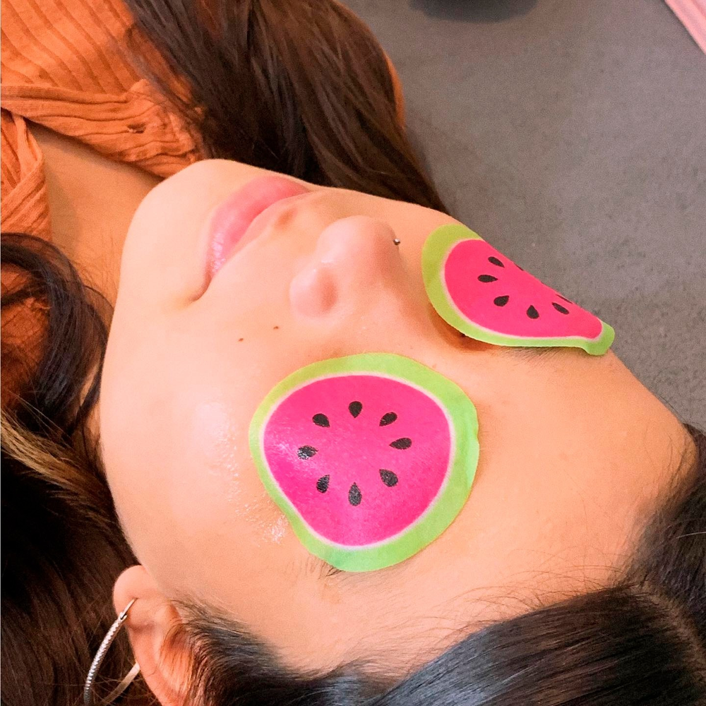 Almohadilla refrescante con extracto de sandía para ojos. Consisten en dos almohadillas redondas las cuales se aplican sobre los ojos para refrescar y renovar tu mirada, sacando así las ojeras.