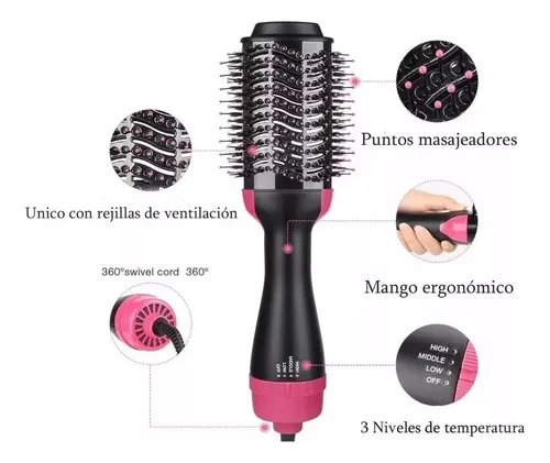 Funcionalidad 2 en 1: Permite secar y peinar el cabello simultáneamente, alisando, dando volumen y reduciendo el frizz. Tecnología: Utiliza tecnología iónica y cerámica para ayudar a reducir el daño por calor y la estática, dejando el cabello suave y brillante. Ajustes de calor y velocidad: Ofrece múltiples configuraciones de calor y velocidad para adaptarse a diferentes tipos de cabello y estilos de peinado. Diseño: Cuenta con un diseño de cepillo ovalado para alisar y dar volumen desde la raíz, y un cable giratorio de 360 grados para facilitar su uso. CONSULTAR COLORES DISPONIBLES.