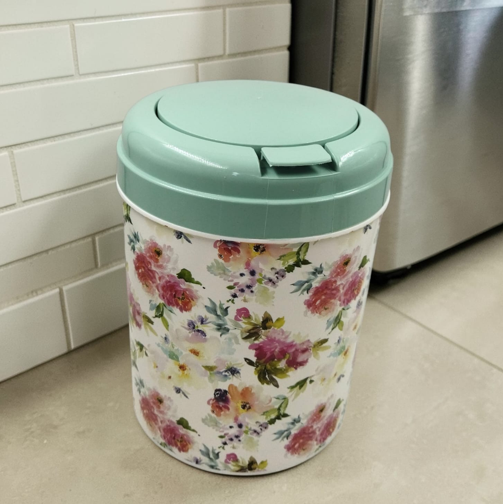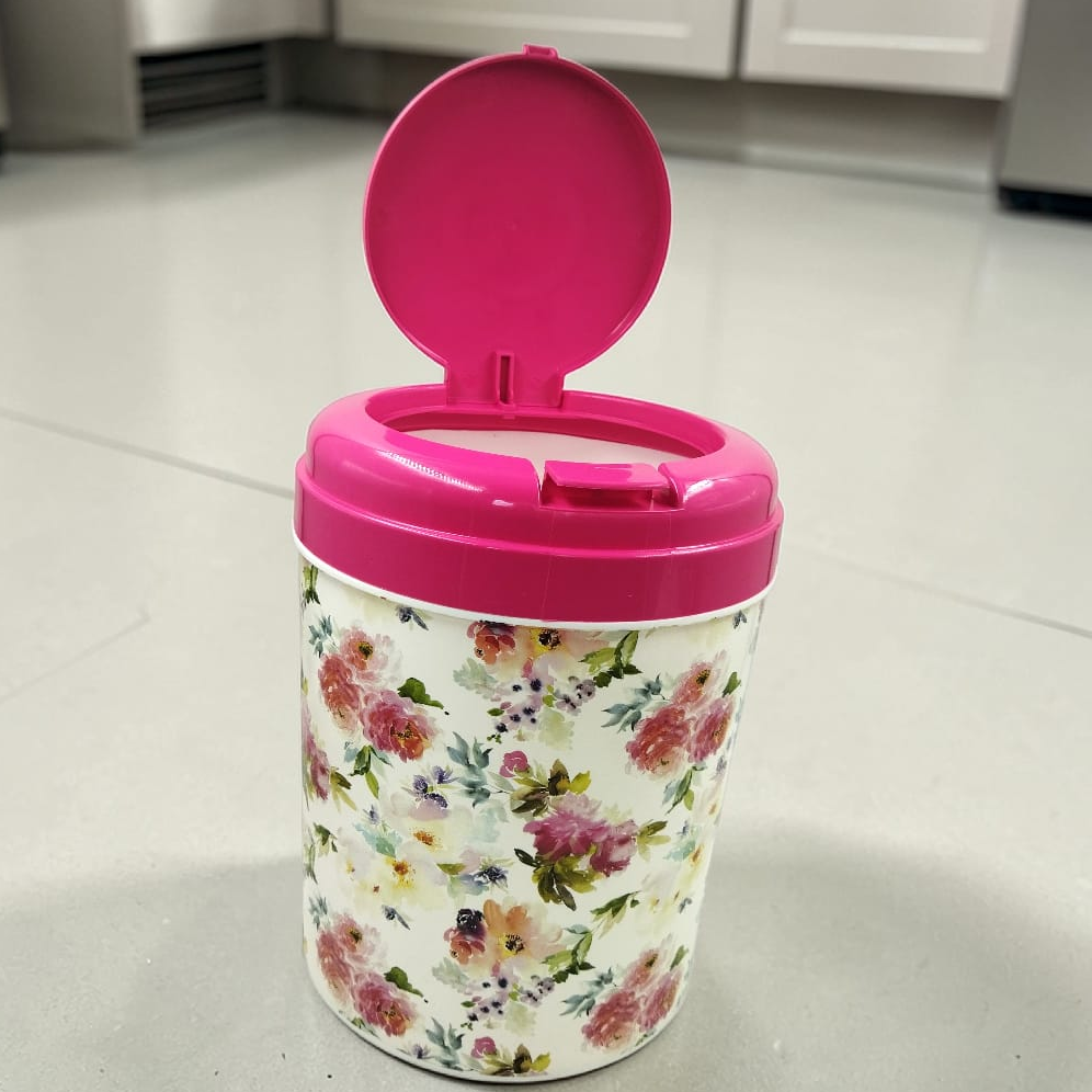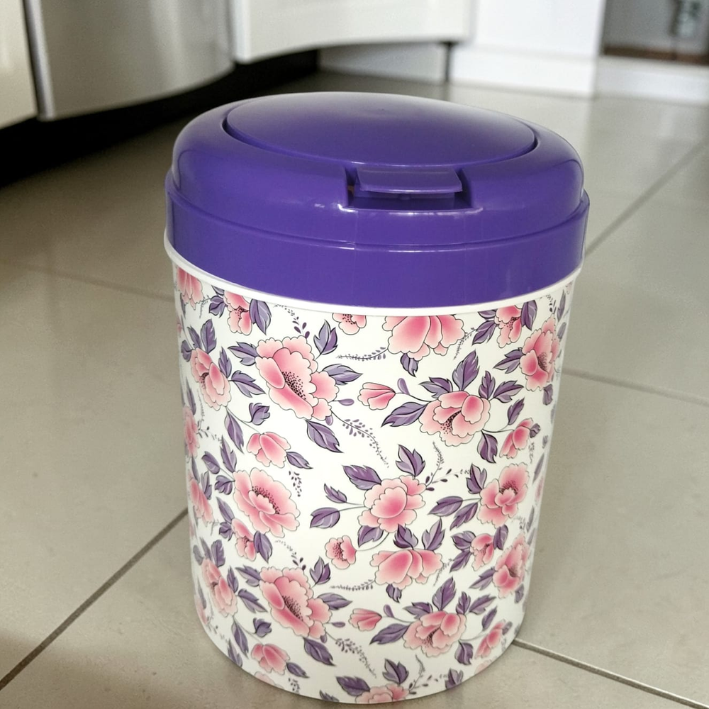 tacho de basura plastico con tapa a click rebatible , capacidad: 7 litros, cuerpo estampado de flores. Consultar estampa y colores disponibles (Violeta, fucsia, rosa, verde). tamaño ideal para la casa/oficina/taller, practico y resistente.