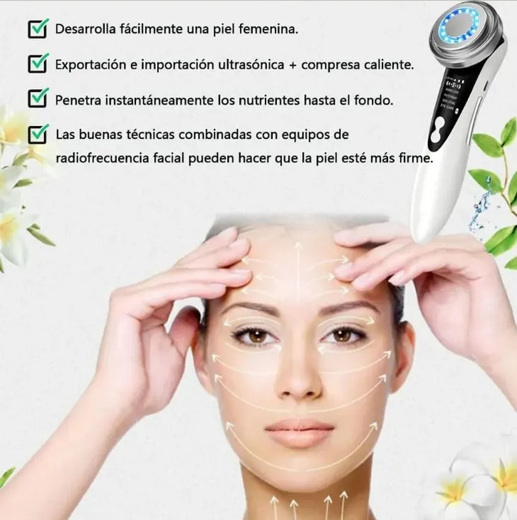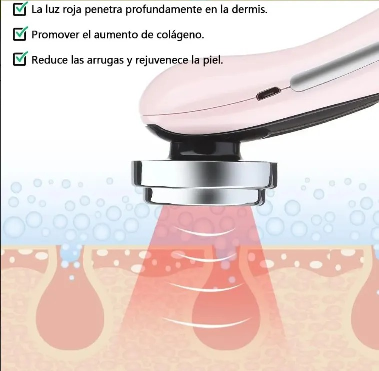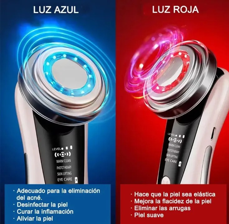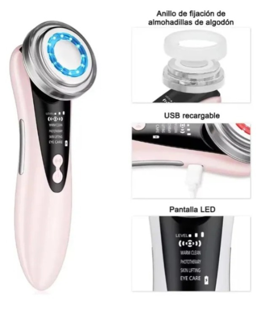 El Masajeador Facial Multifuncional 5 en 1 es una herramienta avanzada para el cuidado de la piel, diseñada para mejorar su apariencia y salud. Cuenta con cuatro modos de trabajo que incluyen limpieza profunda, terapia de luz roja y azul para el rejuvenecimiento, masaje térmico para lifting y tratamiento específico para el contorno de ojos. Su diseño compacto y carga USB lo hacen perfecto para uso en casa o viajes, proporcionando un tratamiento profesional en cualquier momento.