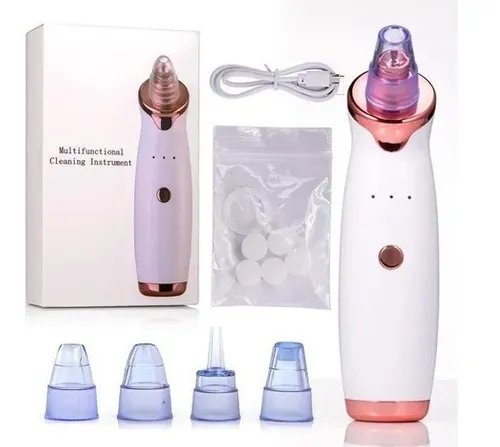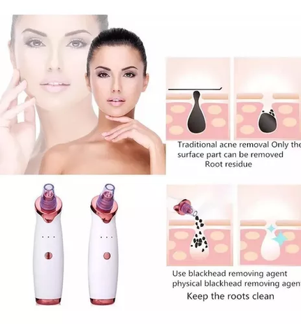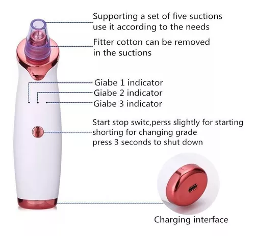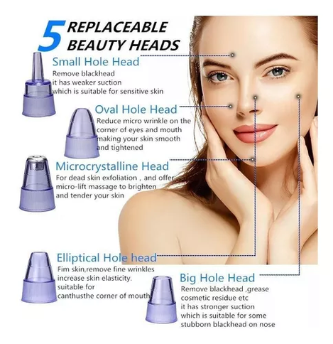 Extractor*Eliminador de espinillas faciales eléctrico Se puede usar para eliminar profundamente los puntos negros, el acné y la cara limpia y es adecuado para el tratamiento de la piel seca, la piel flacidez, La Piel opaca y también las arrugas, lo que aumenta la circulación sanguínea en la piel Viene con 5 cabezales de belleza cambiables, que pueden ofrecer diferentes funciones y ofrecer una limpieza más profunda para su piel facial La succión ajustable de muchos niveles lo hace adecuado para diferentes pieles Característica Material: ABS Capacidad de la batería: 450 mAh Método de carga: cable USB Instrucciones: